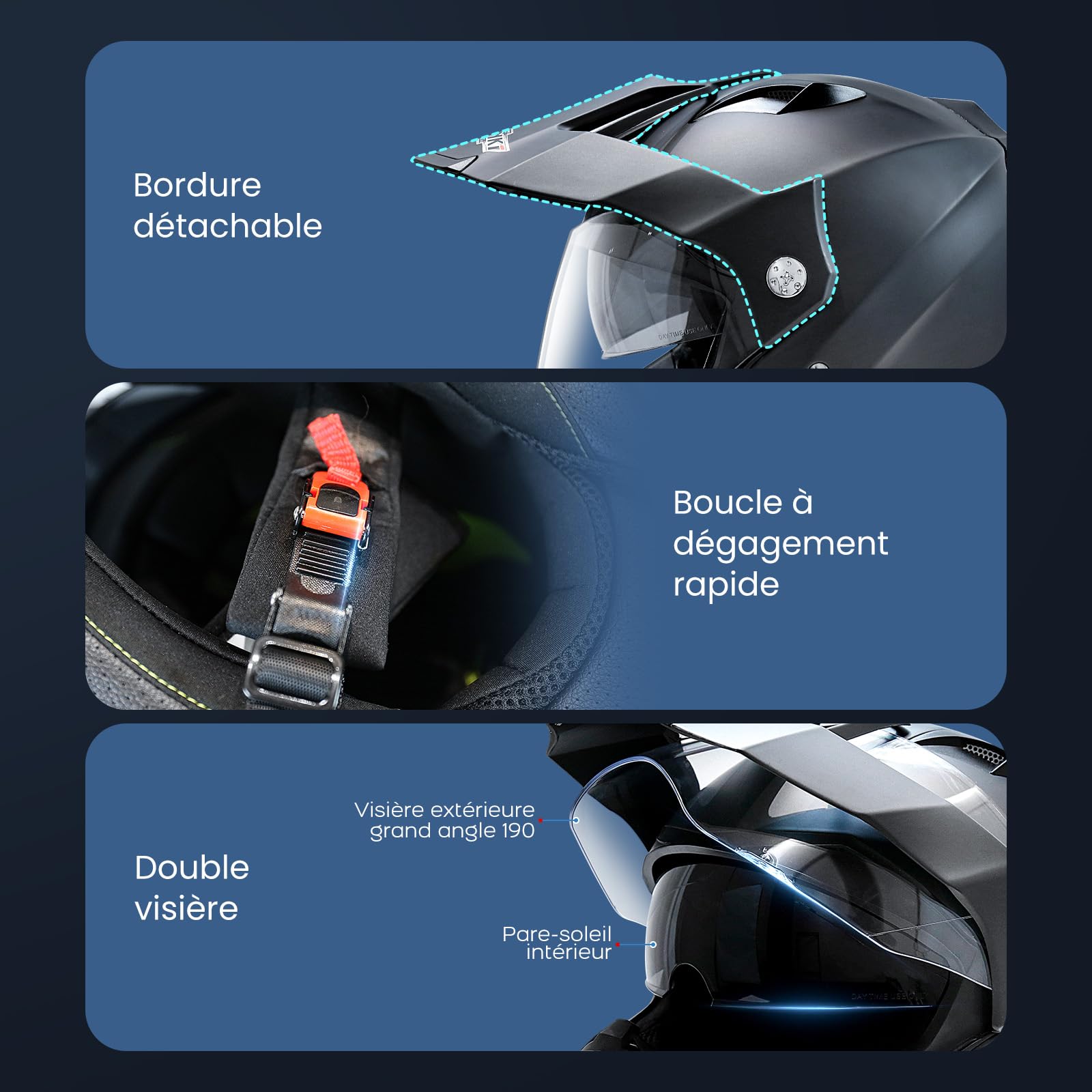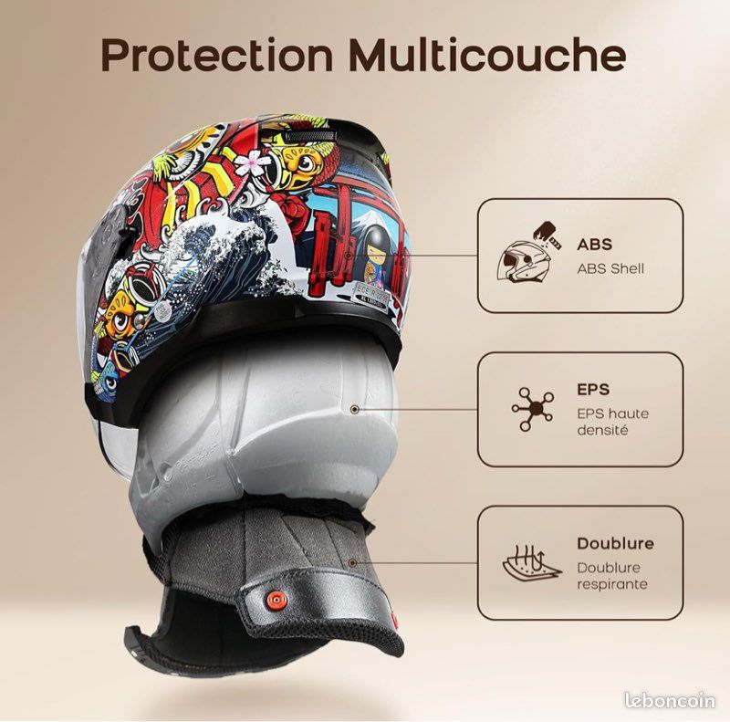 Casques De Moto Casque Moto Intégral NENKI ECE 22.06 - Modulable Depuis 2021, une nouvelle révision du règlement, ECE R22-06 (Economic Community of Europe) est apparue pour améliorer les tests et assurer une sécurité plus forte, norme 22-06 qui devient... Casque Moto Ventilation Intégrale Doublure Lavable Casque Moto NENKI Modulable - Homologué ECE 22.06 - Double Casque Moto Intégral ECE 22.06 SÉCURITÉ & HOMOLOGATION : Ce casque moto est homologué ECE 22., 07., Grâce à sa coque externe en ABS robuste et son intérieur en EPS, ce casque intégral offre une protection optimale et une absorption des chocs. VENTILATION & CONFORT: Quatre entrées d’air stratégiquement placées (haut avant/arrière, front, bouche) assurent une circulation d’air frais et réduisent la buée. Description Pour rouler en toute sécurité, ce casque NENKI est un vrai bijou ! Homologué ECE 22.06, il dépasse les normes de sécurité européennes. Coque en ABS robuste avec mousse EPS multi-densité pour une protection maximale sans alourdir. Le système modulable permet de relever la mentonnière - pratique pour boire ou discuter sans enlever le casque. Visière double avec pare-soleil... Idéal comme casque scooter homme ou casque femme moto. VISIBILITÉ ET EXTRAS: Système pratique de double visière — visière principale transparente (protection UV) + visière solaire intégrée. Ce casque de moto homologué (environ 2000 g) allie protection robuste et qualité durable, convenant parfaitement comme casque scooter homme ou casque femme moto. ÉQUIPEMENT MODERNE: Ce casque intégral est prêt pour le Bluetooth (logement prévu pour système de communication, vendu séparément) et dispose d’une fermeture micrométrique rapide pour une mise en place simple et sûre.