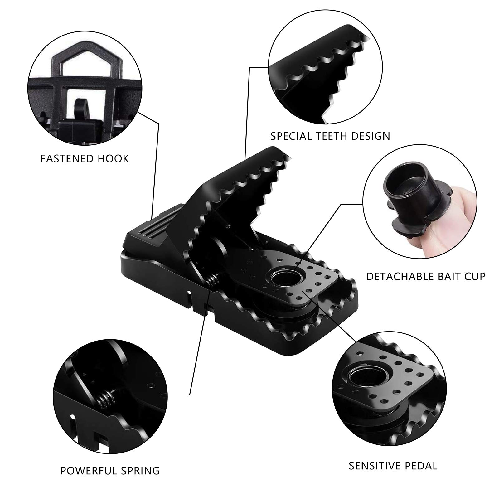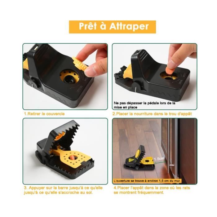 Tekenewbse Piège à Rats Professionnel, 8 Clips de Piege a Souris Dutreg Pièges à Souris, 6 Pièges Réutilisables Tapette Souris, Efficace... Piege à Souris Lot De 8 Tapette Souris, Mouse Trap Professionnel, Piège à Souris Piège à Souris Sensible Lot 8 Informations sur le produit Nom du produit : Piège à souris (pack de 8) Matériau : Plastique PS + fil d'acier Dimensions (chacun) : 11,2 × 4,8 × 5,6 cm Sensibilité au déclenchement : 10–20 g Force du ressort : 0,6–0,8 kg Couleur : Noir Réutilisable : Oui Scénarios d'application Idéal pour la cuisine, le garde-manger, le garage, la cave, le jardin et d'autres zones intérieures ou extérieures protégées. [Haute Sensibilité au Déclenchement (10-20 g)] Réagit même à la plus légère touche, attrapant instantanément les petits et grands rongeurs, sans déclenchement accidentel dû à de légères vibrations. Piège à Souris 8 PCS, Réutilisable Piège à Rat avec Ressort Puissant et... [Puissante Force de Morsure, Aucune Échappatoire] Les dents de scie améliorées de la souricière augmentent la force de serrage et empêchent les souris ou rats de s’échapper, offrant une lutte contre les nuisibles à la fois humaine et efficace. [Design Sûr et Stable] Le mécanisme de ressort optimisé empêche les déclenchements accidentels ; il est sûr à utiliser dans la cuisine, le garage et le garde-manger. [Durable et Réutilisable en Pack de 8] Fabriqué en plastique PS robuste et fil d'acier inoxydable, résistant à la rouille et conçu pour un usage à long terme ; idéal pour la cuisine, le garage, la cave, le garde-manger, le jardin, le cabanon et d'autres zones intérieures ou extérieures protégées. [Placement Facile Avec Compartiment à Appât Intégré] Retirez simplement le couvercle de l'appât en bas, insérez l'appât approprié et appuyez sur le déclencheur pour tendre le piège.