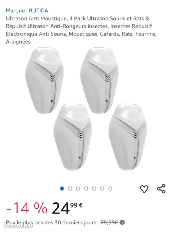 6 Pack Répulsif Sans Produit Chimique Ultrason Pour Souris Et Rats 6 Pièces, Anti Moustique Ultrason Repulsif Ultrason Appareil Ultrason Pour Nuisible Antiparasitaire Repulsif Pour Mous 97086216 Ultra Son Souris Et Rats Puissant Répulsif Ultrason Anti Moustiqueé, Répulsifs a Moustiques Lot de 6, Anti Moustique Interieur Ultrason Anti oustique, 6 Pack Répulsifs a oustiques & Ultrason Souris et Rats, Insectes... Il suffit de brancher notre répulsif à ultrasons dans une prise., Remarque: 1., Anti-moustique électronique Éloignez-vous des tapis, des rideaux et de tout matériau qui absorbe le son qui peut affecter l'effet., 2., Si vous avez mentionné des insectes ou des hamsters comme animal de compagnie, n'utilisez pas cet anticorps de souris près de vos animaux de compagnie., 3., Il est normal que la souris et les parasites augmentent au début des jours d'utilisation, car ils s'éloigneront du lieu de vie après que les animaux auront été attaqués par ultrasons., 4., L'effet du produit peut être mis en évidence après une utilisation constante pendant une période de 3 à 4 semaines. ✔【Répulsif Ultrason】Ce répulsif à ultrasons est la dernière version de 2025, Utilisation de la théorie des ultrasons, changer fréquence afin de stimule le système auditif du moustique et les autres insecte nuisible, rendez-les insupportables et sentez pas à l'aise. ✔【Facile à installer 6 Pack】il suffit de brancher cet appareil dans une prise verticalement, la lumière bleue s'allume et fonctionne automatiquement. Spécifications du produit: Matériel: ABS Couleur: Blanche Puissance: 4-6W Tension d'entrée: 90V ~ 250V Fréquence ultrasonique: 22-65 KHz Technologie du produit: Ultrasound + Sawtooth Wave Le forfait comprend: 6 * Répulsifs à ultrasons La lutte antiparasitaire par ultrasons prend généralement 3 à 4 semaines pour obtenir des résultats différents, selon le degré d'infection. Il est également idéal pour les Chambres, les centres commerciaux, les bureaux, les garages, les greniers, les sous - sols, les entrepôts. Vous direz au revoir aux pièges à souris, tapis de souris, venins nuisibles, pesticides pulvérisés et plus encore. Répulsif Ultrason Anti-Rongeurs, 4 Pack, Intérieur, Répulsif Électronique pour Insectes...