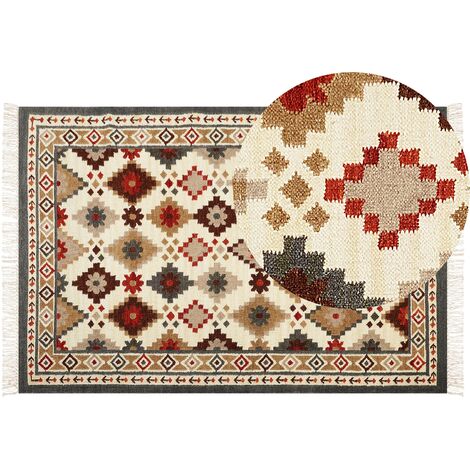 Tapis Oriental Boho Tapis Kilim En Laine Multicolore 200 X 300 Cm Aygavan - Tapis Salon Et Tapis Laine Tapis Kilim En Coton 140 X 200 Cm Multicolore Parakar - Tapis salon et Les deux extrémités du tapis sont ornées de pompons décoratifs. Tissé en laine et coton, ce qui rend le tapis durable et facile d'entretien. Tapis Kilim Multicolore en Laine 200 x 300 cm avec Pompons Oriental... La pièce présente un motif géométrique de type bohème, décliné en plusieurs couleurs. Détails: Type de produit: Kilim Style: Boho Couleur principale: Multicolore Type de matière: Tissu Matière principale: Laine Matière secondaire: Coton Composition de la matière: 80% en laine Forme: Rectangulaire Fond anti-glisse: Non Grammage: 1400 g/m2 Motif: Motif oriental Convient avec le chauffage au sol: Oui Tissage: Fait à la main Dimensions: Hauteur du tapis: 1 cm Largeur: 200 cm Longueur: 300 cm Poids: 9 kg L`offre inclue: 1 x Tapis Caractéristiques clés: Fabriqué à la main avec le plus grand soin, Convient pour le chauffage par le sol, Solution parfaite pour la chambre et le salon, Un facteur de confort dans votre intérieur, De haute qualité Informations d`assemblage: Ne nécessite pas d'assemblage Informations supplémentaires: Le produit peut perdre des poils au fil du temps, Les couleurs, les motifs et les tailles (+/- 5-7 cm) peuvent différer de la photo, car chaque tapis est fait à la main. Les différences de couleur et de structure sont des preuves d’authenticité et sont en aucun cas considérés comme un défaut. Tapis oriental fait main.