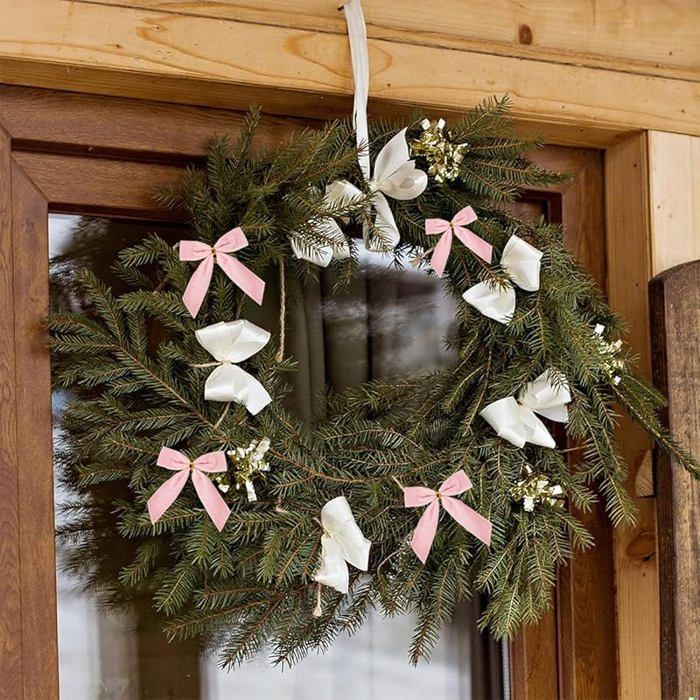 Couronne de Noël mise à plat Couronne minimale avec des branches de Large application : le nœud en ruban de velours peut être attaché aux arbres de Noël, couronnes, boîtes cadeaux, portes, cheminées, etc. Il est également adapté pour la décoration de centres de table, vases, cartes d'invitation, emballages cadeaux et loisirs créatifs Nœud Rouge Velours Lot De 12 Nœuds En Velours Pour Couronne De Sapin De Noël, Ruban Ruban Velours Les petits nœuds en velours ont des fils à l'arrière, peuvent facilement attacher les nœuds de couronne de Noël où vous le souhaitez Vous pouvez les utiliser de nombreuses fois et les garder pendant une longue période Lot de 12 petits nœuds de Noël en velours de 8,9 cm pour couronne de Noël rustique - Nœuds en ruban de velours vintage - Décorations de vacances pour guirlande... Taille adaptée : la largeur des nœuds en velours est de 2,5 cm, le nœud mesure 8,5 cm de large et 9,5 cm de long, aspect charmant et délicat, adapté pour sapin de Noël, couronne, porte, cheminée, mur, décorations de cadeaux Faciles à accrocher : ces nœuds en ruban de Noël sont déjà noués dans un joli nœud, de sorte que tout ce que vous avez à faire est de les attacher à l'arbre ou aux cadeaux à l'aide de nos attaches torsadées. Il est également adapté pour la décoration de centres de table, vases, cartes d'invitation, emballages cadeaux et loisirs créatifs Comme il s'agit d'une cravate torsadée, elle permet également un retrait facile pour profiter de votre fête