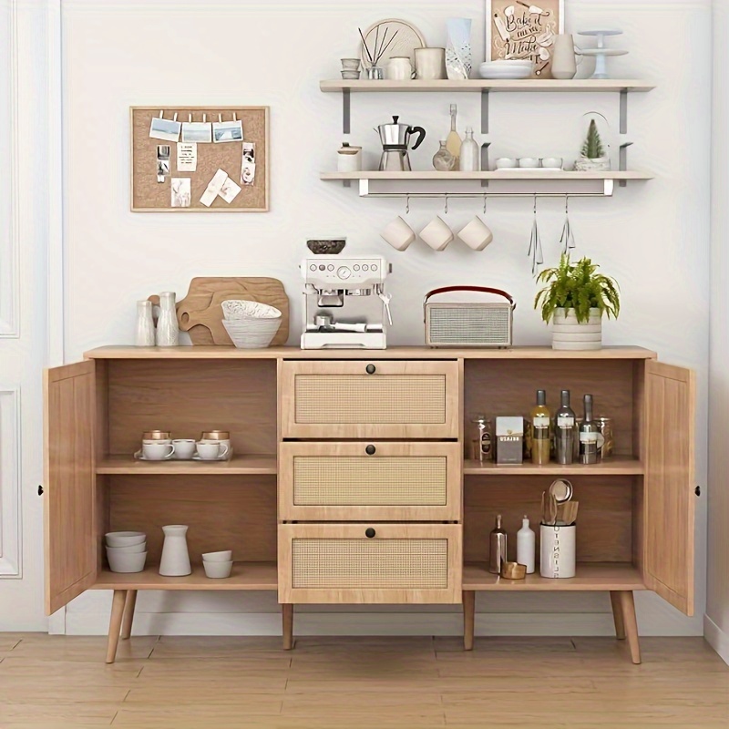Buffet Cuisine Salle à Manger Buffet Cuisine étagères Réglables Rotin Naturel - 80x40x70 Cm - Noir - 3 Étages Réglables - Cuisine, Salon, Salle à Manger Buffet Rangement Commode Etagères Reglables Anmytek H0095 Buffet de rangement en rotin naturel avec 2 portes Buffet meuble tv avec étagères réglables commode verticale rangement... La porte en rotin aérée permet une circulation de l'air, maintenant l'armoire sans odeurs. Les étagères réglables s'adaptent à la taille des objets. Le plateau supporte jusqu'à 40 kg. 【Armoire Style Naturel]】Ce buffet de cuisine en rotin, aux veinures de bois naturel et deux portes cintrées en rotin tissé à la main, apporte une élégance bohème et devient un point focal dans votre pièce, insufflant une touche de chic et de raffinement. Grâce à la hauteur et à l'espace sous la commode, un robot nettoyeur peut se déplacer librement et nettoyer tous les recoins. C'est un ajout esthétique et fonctionnel à votre intérieur. Vous pourrez l'assembler sans effort et profiter de l'espace de rangement supplémentaire et du charme naturel qu'il apporte à votre maison. En entrant dans votre espace de vie, vos yeux sont attirés par les courbes douces des portes en rotin. Les tons de bois naturels créent une atmosphère accueillante, vous mettant instantanément à l'aise, vous et vos invités