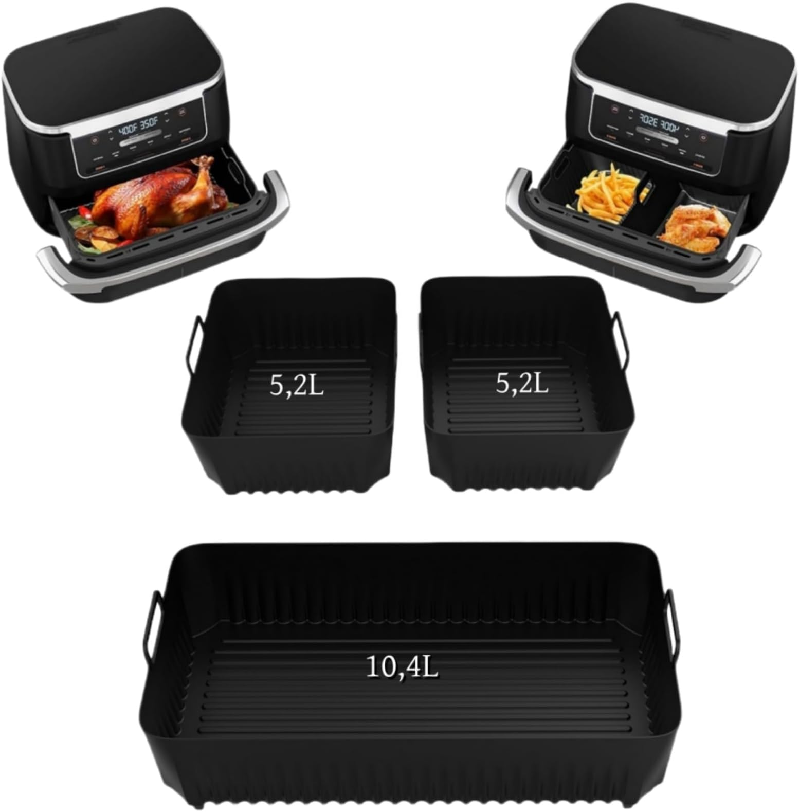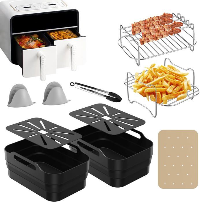 Accessoires Air Fryer Ninja - Accessoires Friteuse Air pour Ninja AF500EU et 10,4L Sans BPA Les moules à gaufres, beignets, pains et gâteaux facilitent la préparation de toasts, de pain, de gaufres, de gâteaux mousseline et autres pâtisseries. Air Fryer Ninja 10,4 L TTLIFE Accessoires Air Fryer Pour Ninja Air Fryer 10,4L AF500EU,avec Moules Gaufres Beignets Air Fryer La grille et les brochettes sont parfaites pour griller des kebabs, des ailes de poulet, des saucisses, du bacon, etc. Grâce à son revêtement antiadhésif doux et réutilisable, cet ensemble d'accessoires pour friteuse à air garantit une cuisson sans souci, que vous prépariez des frites et des légumes croustillants, des gâteaux ou des brochettes 9 Pcs Accessoires Pour Airfryer Ninja 2024 Nouveaux Accessoires Air... Grâce à son revêtement antiadhésif doux et réutilisable, cet ensemble d'accessoires pour friteuse à air garantit une cuisson sans souci, que vous prépariez des frites et des légumes croustillants, des gâteaux ou des brochettes 【Ensemble complet d'accessoires】: Accessoires Airfryer chaud comprend : 3 moules en silicone (1x10,4L & 2x5,2L) pour isoler efficacement les aliments de la friteuse, 5 brochettes et 2 grilles de cuisson pour griller des plats délicieux, 4 gâteau-/ 2 gaufres-/ 1 donut -/ 2 pain moule silicone pour préparer des snacks savoureux, ainsi que des ustensiles de cuisson : 1 spatule en silicone, 1 pinceau de cuisine en silicone et une paire de gants épais en silicone 【Durable et facile à nettoyer】 : Accessoires Air Fryer passent au lave-vaisselle, vous laissant les mains libres. Moule silicone vous permet de préparer une grande variété de plats. 【Matériaux sûrs et sains】 : Moule Silicone Air Fryer Set et Grille sont fabriqués en silicone/ Acier inoxydable de qualité alimentaire et résistent à la chaleur jusqu'à 240 °C., sont sans BPA. Accessoires Air Fryer Set pour Ninja 10., 4L Vidéo de marchand