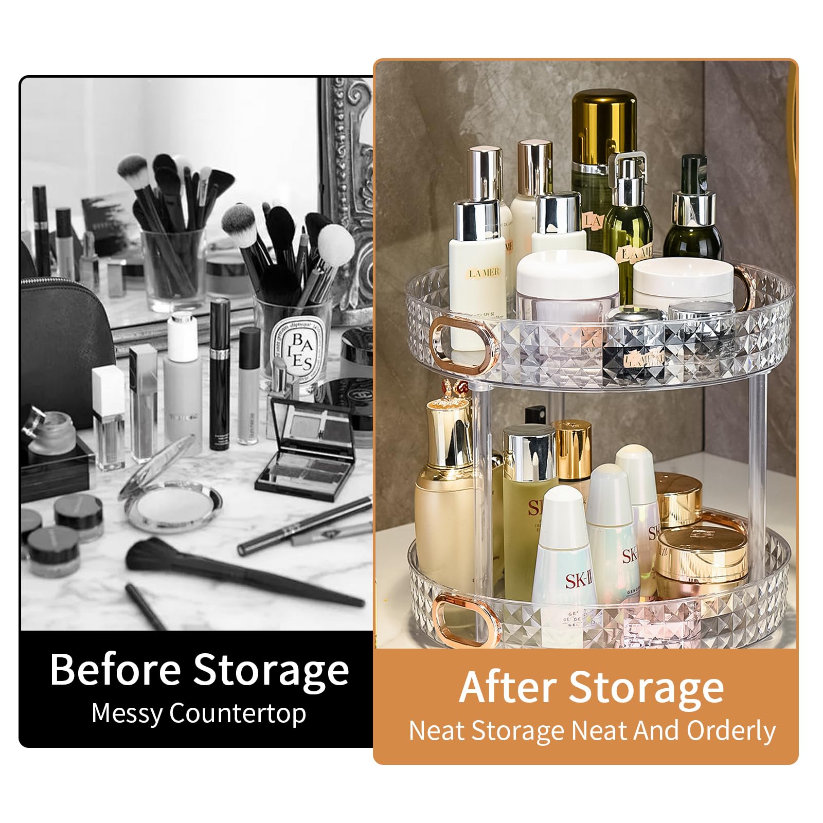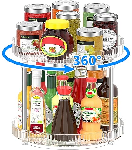 Wesoke Lazy Susan Plateau tournant à 2 étages Grand support à épices de cuisine Plastique sans BPA. L'organiseur de placard tournant peut être utilisé dans une série de scènes telles que la cuisine, le salon, la chambre, la salle de bain, etc. L'organisateur de maquillage rotatif tourne facilement, même peut contenir beaucoup de conteneurs. Bords surélevés Le bord du plateau tournant mesure 4,5 cm de haut, le bord surélevé empêche les objets de tomber. Design amovible, facile à nettoyer. Il peut organiser réfrigérateur, garde-manger, placard, commode, etc. Organisateur Condiments Salle De Bain Kitstorack Plateau Tournant En Acier, 2 Niveaux Lazy Susan Rangement Epices Cuisine, Plateau Tournant Frig Epices Organisateur Plateau Tournant à 360° Range Epices Cuisine Pour Salle De Bain Plateau Tournant Lazy Susan Plateau Tournant Lazy-Susan pour Armoire, éTagèRe à éPices Rotative Le plateau tournant de salle de bain garde les bouteilles visibles pour une sélection rapide et sortir le contenu intérieur., Organiseur polyvalent. Le plateau de rangement de cuisine est fabriqué en plastique 100 % sans BPA, avec une texture antidérapante sur la surface et le fond. Double couche et gain de place : étagère à épices à 2 niveaux de taille : 27 cm de diamètre, 23,5 cm de hauteur (hauteur intérieure de 19 cm), assez pour stocker des boîtes à épices de cuisine, des huiles, des bocaux et des condiments, etc. Plateau Tournant Epices,Lazy Susan Plateau Tournant En Plastique À 2... Économisez de l'espace et rangez plus dans une zone limitée. Facile à installer : aucun outil n'est nécessaire pour l'installer, il suffit d'insérer le tube en plastique dans la rainure pour terminer l'installation. La hauteur du bord du plateau tournant est de 4,5 cm, ce qui empêche les articles de tomber. Lazy Susan Plateau Tournant À 2 Niveaux U2013 Accessoire De Rangement... Organisateur polyvalent : notre plateau tournant est adapté pour les salles de bains pour stocker des articles de toilette ; il est également adapté pour les réfrigérateurs pour stocker des boissons, des fruits et des légumes ; il est également adapté pour les commodes pour stocker des cosmétiques et des parfums. Le design transparent vous permet de sélectionner et de sortir rapidement les articles à l'intérieur. Plateau tournant transparent à 2 niveaux Cet organisateur transparent est livré avec deux niveaux pour vous aider à maximiser votre espace limité.