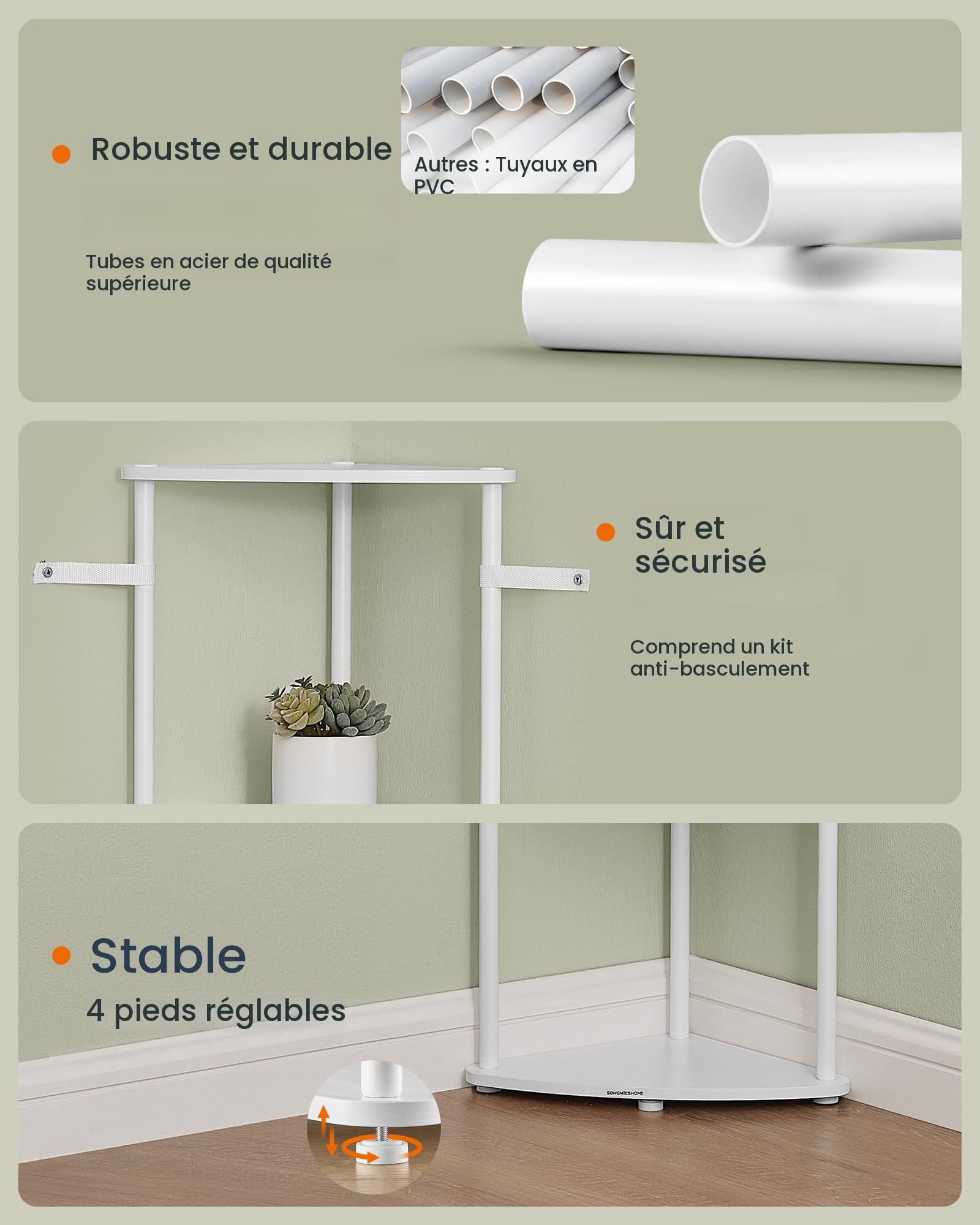 Contenu de l'emballage : - 1 étagère d'angle à 5 niveaux. - Polyvalent : parfait pour le salon, la chambre, le bureau à domicile, le couloir, le balcon et la cuisine. - Grand espace de rangement : mesure 38,3 x 27 x 139 cm, avec 5 niveaux et une distance de 33 cm entre les étagères, offrant beaucoup d'espace. - Charge maximale : Capacité de charge statique au total : 50 kg. - Stable et sûr : équipé de 4 pieds et d'un kit anti-basculement. Assemblage super rapide sans outil : installez cette étagère d'angle en seulement 10 minutes, aucun outil n'est nécessaire. Avec les vis à double extrémité... Polyvalente : cette étagère d'angle est vraiment polyvalente, que ce soit dans le salon, la chambre, le bureau, la salle de bain, le couloir, la cuisine ou sur le balcon, elle s'adapte parfaitement à n'importe quel espace pour accueillir vos articles - Charge maximale : Capacité de charge statique par étagère : 10 kg. Description du produit Aperçu des points forts de l'étagère d'angle : - Montage ultra rapide sans outil : aucun outil nécessaire, montage en seulement 5 minutes. Charge 10kg Par Niveau 50kg Total SONGMICS ÉTAGÈRE CHAUSSURE à 5 Niveaux, Range-Chaussure, Porte-Chaussure EUR 30,99 - FR Etagere Murale Salle De Bain Étagère de Rangement Mobile à 5 Niveaux avec Dispositif Anti... C'est aussi simple que des blocs de construction Assemblage super rapide sans outil : installez cette étagère d'angle en seulement 5 minutes, aucun outil n'est nécessaire. Avertissement De Sûreté Veuillez fixer l'étagère au mur avec le kit anti-basculement inclus pour garantir une utilisation sûre. Robuste et stable : fabriquée à partir de panneaux de particules résistants aux rayures et d'acier robuste, cette étagère de rangement d'angle est stable, durable et peut supporter jusqu'à 10 kg par niveau (50 kg au total). Juego de patas para somier metal, , 3 x 27 x 3 | Maisons du Monde En connectant les tubes avec des vis à double extrémité, vous pouvez rapidement installer tous les niveaux. Caractéristiques : - Couleur : blanc neige. - Poids du produit : 3,8 kg. - Aspect esthétique : donne un charme minimaliste à votre intérieur.