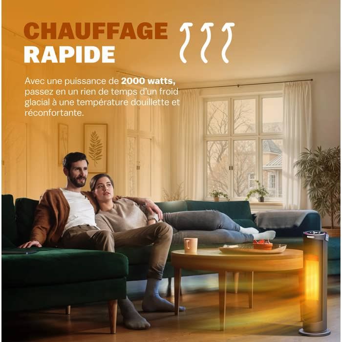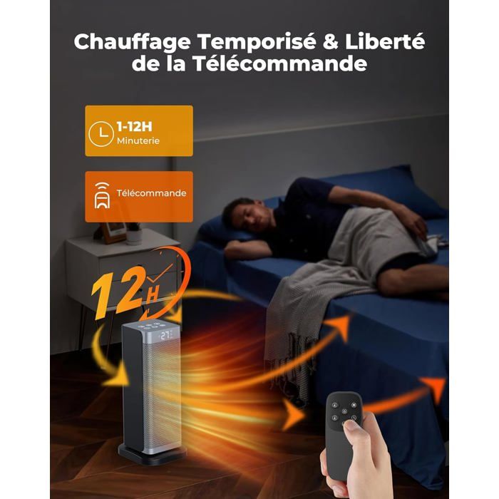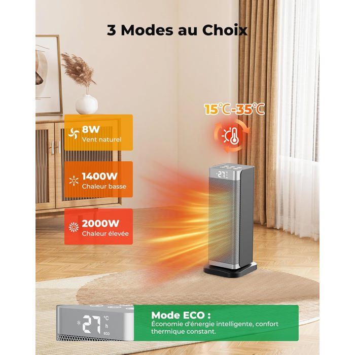 Que ce soit pour un flux d'air doux ou une chaleur intense, ce radiateur électrique portable s'adapte parfaitement à chaque pièce et à chaque saison Le radiateur est particulièrement silencieux, ce qui permet de garder la chambre à coucher, la chambre d'enfant et le salon au chaud et au calme. Fonctions de sécurité multiples --- Ce radiateur soufflant en céramique est équipé de plusieurs systèmes de protection, notamment une protection contre le basculement, une protection contre la surchauffe et une sécurité enfants (en appuyant longuement sur le bouton de la minuterie pendant 2 secondes). 4 modes de chauffage et température réglable --- Adaptez votre chaleur de bien-être individuellement, entre 16 °C et 35 °C, avec un contrôle précis de la température pour chaque pièce. Chauffage d'appoint mobile - chauffage et climatisation - Noir La télécommande permet de contrôler facilement la température, le mode, l'oscillation et la minuterie. Ce radiateur électrique combine chauffage rapide et efficacité énergétique, parfait pour des journées d'hiver agréablement chaudes MONZANA® Radiateur soufflant noir céramique 2000W 15-35°C économique oscillation 70° chauffage d... Vous pouvez ainsi profiter d'une chaleur puissante et uniforme en toute tranquillité, que ce soit pendant la nuit ou au quotidien En mode ECO intelligent, le radiateur soufflant maintient la température ambiante à environ 26 °C avec une puissance réduite d'environ 650 W. Idéal pour tous ceux qui recherchent un radiateur soufflant silencieux pour leur maison, fiable et agréable à utiliser Radiateur Bain D'huile Chauffage ;Appoint Économe Noir - 2000W PTC Céramique, 4 Chauffage Oscillation 70° Sécurité Ce radiateur soufflant électrique offre quatre modes : Vent naturel (5 W) pour une brise douce, chaleur moyenne (650 W) pour un chauffage uniforme, chaleur élevée (2000 W) pour un chauffage rapide, ainsi que le mode ECO intelligent pour un fonctionnement économe en énergie Le chauffage électrique portable offre une sécurité fiable pour les familles avec des enfants ou des animaux domestiques.