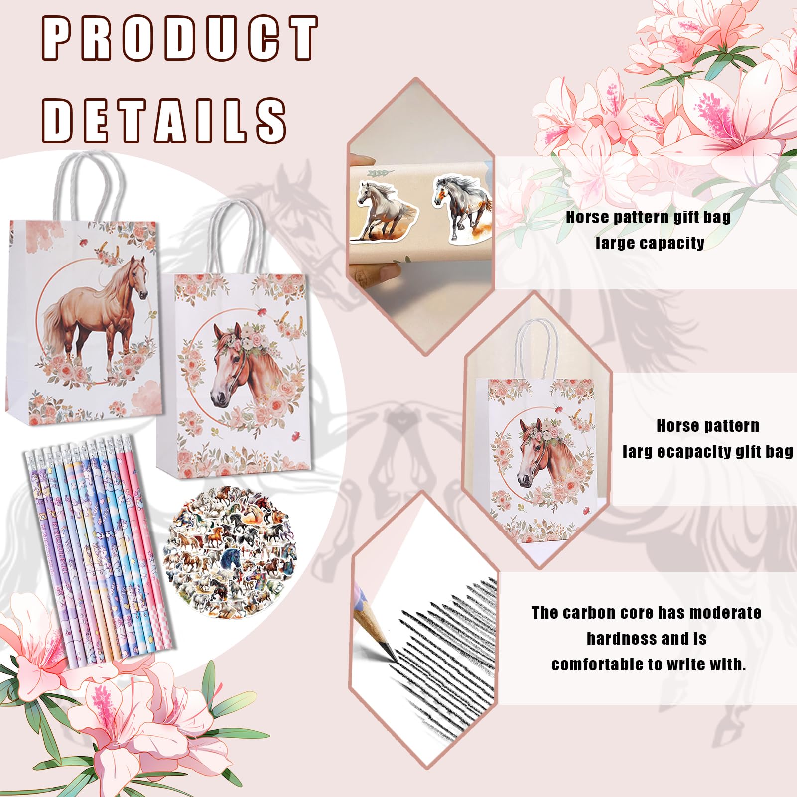 6 Pièces Sacs-Cadeaux Faire La Fête Sacs De Faveur 3Cadeaux En Papier Très utile pour les fêtes d'enfants. Petit Chevaux Anniversaire Cheval 12 Pcs Sacs Cadeaux Pour Chevaux Avec Porte-Noms De Fête Papier D'Anniversaire De Cheval 21 X 15 X 8cm Sacs Pour Enfant Fête Thème Cadeaux Fête Cheval Sans danger pour les enfants, non toxique. 9 idées de cadeaux pour les fans de chevaux Lot de 6 sacs cadeaux pour anniversaire d'enfant avec motif chevaux... Les chevaux sauvages au galop et les chevaux sauvages de différentes formes sont pleins de surprises et enfantins. 【Design unique】 notre sac cadeau pour chevaux est bien stable, a la bonne taille à remplir. Créez une atmosphère festive pour une fête d'anniversaire de chevaux pour les enfants Ils créent une atmosphère amusante et amusante pour les décorations de fêtes d'enfants La décoration d'anniversaire imprimée des chevaux des deux côtés a des couleurs vives, des motifs rétro et de beaux détails floraux, ce qui fait de l'ensemble du sac un véritable accroche-regard Kit de cadeau d'anniversaire pour enfants, motif de chevaux, 12 crayons à cheval, 12 sacs cadeaux pour chevaux et 60 autocollants pour enfants, garçons et filles Contenu : 12 sacs cadeaux pour chevaux., 12 crayons de cheval., 60 autocollants chevaux