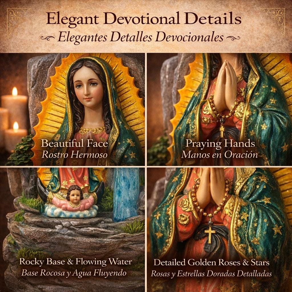 Cadeau chrétien - affiche Notre Dame de Guadalupe Au-delà de sa signification religieuse dans les églises catholiques, ce bénitier peut également être utilisé comme un élégant récipient pour les fleurs ou d'autres objets décoratifs pour la décoration murale Cadeau Religieux église Carte De Prière à Notre Dame De Guadalupe | La Boutique Des Chrétiens Décoration Notre Dame Guadalupe -Crée une et avec la de de Guadalupe, évoquant des sentiments de et de récipient décoratif -Ajoute une touche significative et à tout cadre religieux, symbolisant l'importance foi et dans la décoration de maison -Offre une utilisation polyvalente à diverses fins, comme une tenture murale décorative ou une tenture murale fonctionnelle pour bénitier -Sert de rappel foi et des bénédictions dans rituels religieux, encourageant fidèles à se connecter à source d'eau spirituelle Description des marchandises Décoration murale suspendue pour La capacité modérée rend pratique à utiliser. Tenture murale décorative - de sa signification religieuse dans églises catholiques, ce bénitier peut également utilisé comme un élégant récipient pour des fleurs ou d'autres objets décoratifs, tentures murales de décoration intérieure Notre-dame De Guadalupe, Impératrice D'amérique. Virgen De Guadalupe Avec Un Cadre De Roses... à eau Cette fontaine à eau bénite catholique en résine est conçue pour accrocher une décoration à d'une. Décoration de temple - respire l'élégance et , bénitier en résine ajoute une touche sophistiquée à n'importe quel mur qu'il orne, tenture murale Police holybwater - sûre et pratique à utiliser, pas facile à ou à déformer, réutilisable et peut appliquée pendant longtemps, décoration d'entrée maison Décoration murale décorative - la décoration murale en résine pour bénitier, dotée d'une apparence et , ajoute une touche de sophistication à n'importe quel espace, décoration de salon