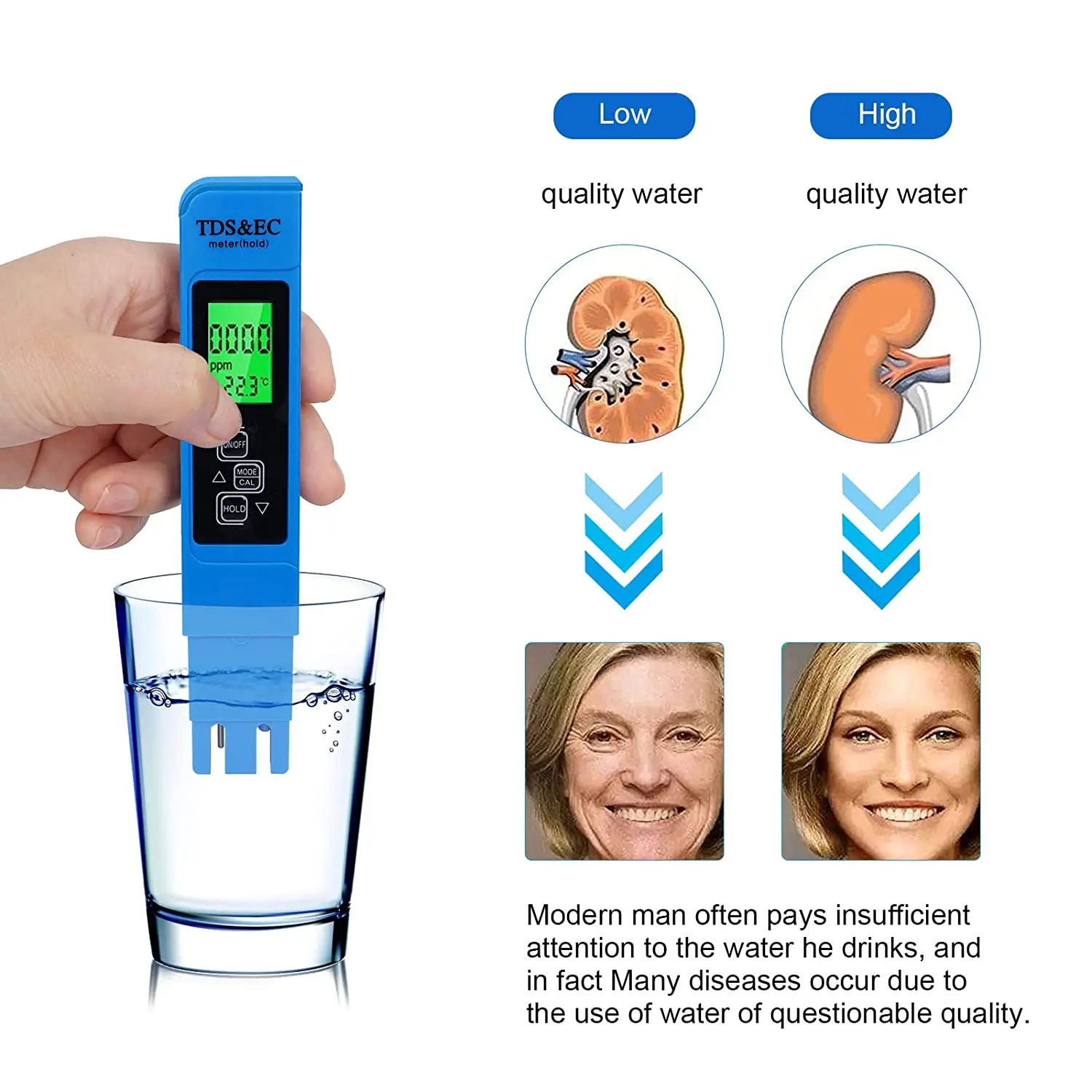 Testeur numérique professionnel TDS : Outil de mesure avancé Sa technologie de capteur haute vitesse garantit des mesures efficaces et précises, parfaites pour les tests en déplacement ou une utilisation fréquente dans les laboratoires et les environnements industriels. Testeur Eau Numérique TDS Testeur D'Eau NuméRique Tds Meter-Kits De Test D'Eau Pour L'Eau Potable Mesure TDS 0-9999 Ppm Conductivité Contenu : 1 stylo multifonction pour tester la qualité de l'eau Testeur TDS Portable pour Aquarium - MARQUE - Modèle - Réservoirs de... 1,79€. 58 vendus 4.7. Testeur numérique de qualité de l'eau TDS EC, plage 0-9999 multifonctionnel, pureté de l'eau, testeur de température PPM · 2,5€. 500... Et le compteur TDS offre des résultats clairs et instantanés. Design portable et compact : mesurant seulement 15 x 3 x 1,5 cm, ce stylo de qualité d'eau est incroyablement compact et facile à transporter. Testeur d'eau multi-paramètres : cet appareil 3 en 1 mesure les solides dissous totaux (TDS), la conductivité électrique (CE) et la température (°C et °F) avec un grand écran LCD rétroéclairé convivial pour des lectures claires dans toutes les conditions Le produit 2 couleurs peut avoir des erreurs pour des raisons objectives, et le produit réel est l'accent principal. Que vous alliez au laboratoire, sur le terrain ou simplement à la maison, son design léger et portable est un ajout pratique à votre kit d'outils de test d'eau. pour répondre à divers besoins., Attention : 1., Les mesures étant prises à la main, les tailles indiquées peuvent varier de 1 à 3 mm.