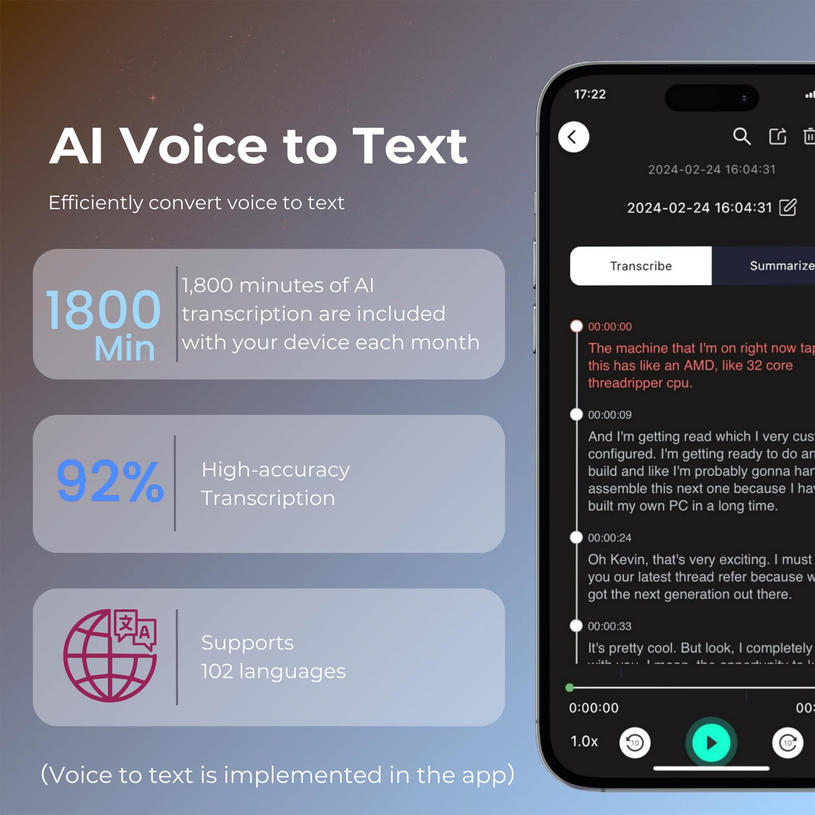 Partage Facile par Email et WhatsApp – Collaboration Instantanée et Sécurisée: Partagez vos enregistrements directement depuis l'application vers WhatsApp, email ou d'autres réseaux sociaux. La fonction de résumé IA propose 6 modèles adaptés : · Réunion · Interview · Entretien · Cours · Consultation médicale · Étude de marché Un titre descriptif est automatiquement généré après le résumé → Pour retrouver facilement vos fichiers Fonction incluse avec l’achat de l’enregistreur, sans frais supplémentaires Enregistrement en un seul clic 1 h de charge = jusqu’à 30 h d’utilisation Protection par mot de passe pour vos enregistrements Activation vocale en option – enregistre uniquement en cas de son détecté Après l’enregistrement, via l’application : · Convertir les enregistrements en texte · Résumer automatiquement le contenu · Générer des cartes heuristiques · Traduire le texte transcrit Comprend 1 800 minutes de transcription par mois. Transcription Automatique 1800 Min/mois Woeaozy 64GB Enregistreur Vocal Numérique IA - Transcription Et Dictaphone Transcription IA Il est recommandé d'enregistrer dans un environnement silencieux pour obtenir des résultats optimaux. Entrez simplement quelques mots-clés, et l’application génère automatiquement un résumé précis, adapté à vos besoins. Sécurité Maximale – Protégez Vos Données Sensibles: Protégez vos enregistrements avec un mot de passe personnel. Aucun stockage cloud : vos fichiers restent sur l'appareil, garantissant une confidentialité totale. PLAUD NotePin Enregistreur Vocal IA avec kit, Contrôle d'application Boîtier en alliage d’aluminium, écran couleur vif et interface minimaliste. Traduisez vos transcriptions directement dans différentes langues – idéal pour les réunions internationales ou l’apprentissage des langues étrangères. Parfait pour les professionnels soucieux de la sécurité de leurs données, sans risque de fuite sur des serveurs externes. Les mises à jour régulières garantissent une expérience toujours optimisée, avec un accès facile à vos enregistrements numériques où que vous soyez. Traduisez vos transcriptions directement dans différentes langues – idéal pour les réunions internationales ou l’apprentissage des langues étrangères. Entrez simplement quelques mots-clés, et l’application génère automatiquement un résumé précis, adapté à vos besoins Enregistreur Vocal IA, Voice Recorder, App Contrôle, Transcrire et Résumer sans Frais, Renforcé par ChatGPT, 64 Go Mémoire, 107 Langues, Audio Dictaphone... Trois modes de lecture : Haut-parleur intégré Lecture avec écouteurs (écouteurs non inclus) Lecture via l’application avec réduction de bruit NR activable Grande capacité et longue autonomie : doté d'une mémoire de 64 Go, il peut stocker jusqu'à 500 heures d'enregistrement et offre une autonomie maximale de 30 heures en utilisation continue, ce qui en fait le choix idéal pour les enregistrements audio professionnels lors de réunions ou d'entretiens. Enregistrement à activation vocale : l'enregistreur numérique AI détecte votre voix et commence automatiquement l'enregistrement, puis se met en pause lorsque vous vous taisez afin d'économiser la batterie et de ne manquer aucun détail. Application Mobile Intelligente: Gérez vos enregistrements avec notre application dédiée, compatible avec iPhone et Android. Plus besoin de câbles compliqués – l'enregistreur vocal Bluetooth permet une communication rapide et sécurisée. Un vrai gain de temps et d’efficacité !, 1