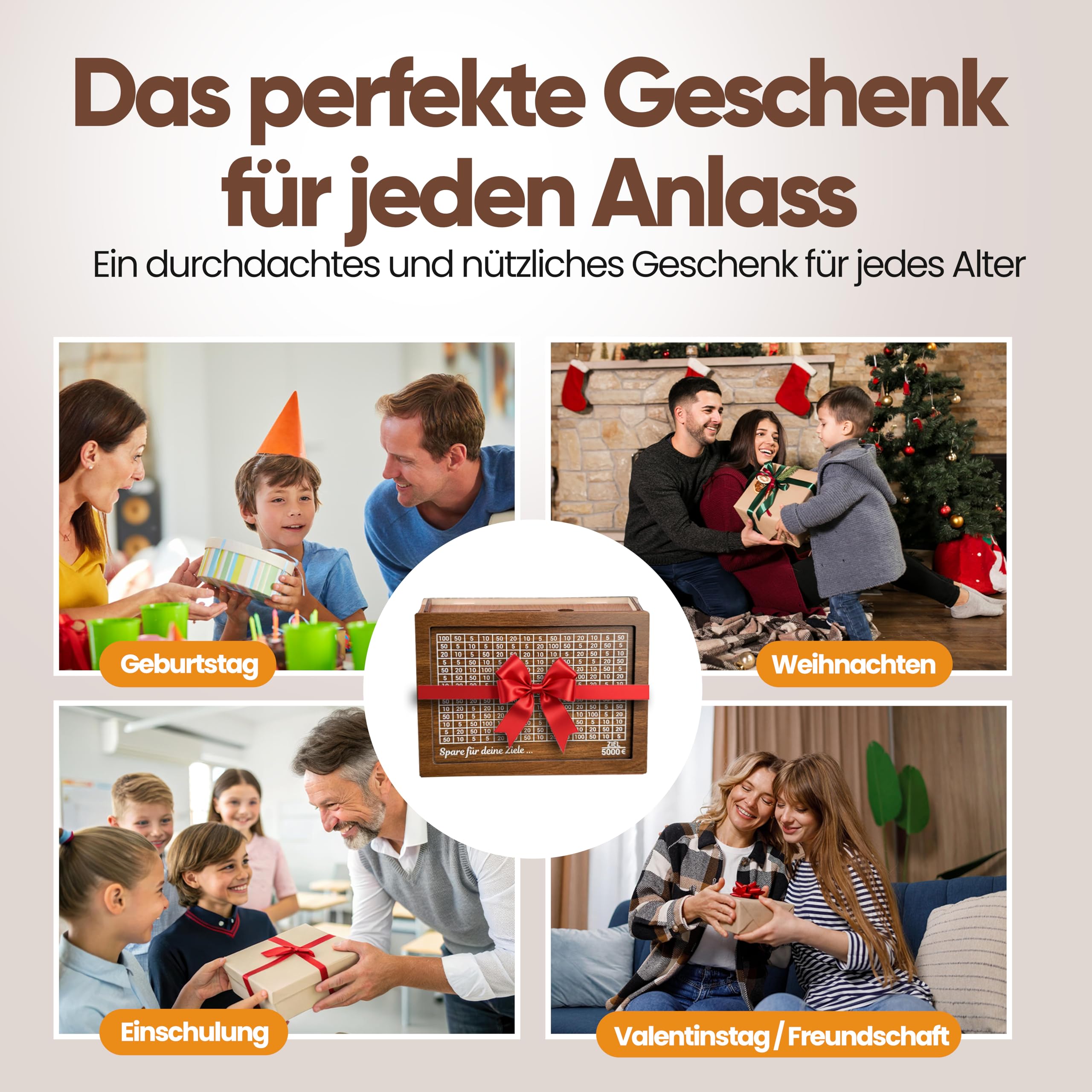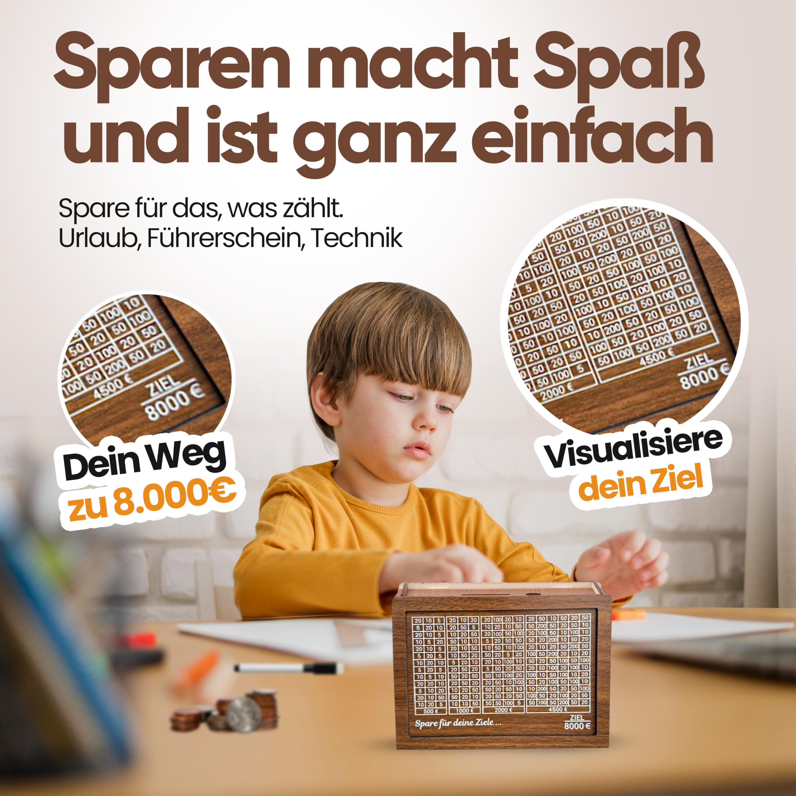 Marquez le montant sur la tirelire et suivez ainsi la progression jusqu'à ce que vous atteignez votre objectif. Fabriquée en bois élégant, cette tirelire permet d'écrire et d'effacer vos objectifs financiers directement dessus. ... deux -mille, cinq-mille ou... La technique Kakeibo est une méthode éprouvée pour apprendre à économiser et à vous mettre sur la bonne voie., Livrée déjà montée. Ce produit est conçu pour atteindre plus facilement l'objectif et augmenter la motivation. Tirelire Kakeibo Tirelire En Bois, Numérique Tirelire Réutilisable Avec Stylo Effaçable Tirelire Bois épargne 2000 Euros Économiser n'a jamais été aussi facile et amusant ! Cette tirelire a été développée sur la base de la technique Kakeibo, une technique japonaise qui permet d'économiser et de gérer de l'argent facilement et confortablement. Faites des économies agréables et faciles : cette tirelire rend l'économie agréable et facile, sans que vous ayez à renoncer à quelque chose. Avec une épaisseur de 3 mm, elle est fabriquée en bois MDF de qualité supérieure et est assez robuste pour vous permettre d'économiser de l'argent., Jusqu'à 2 000 euros. Cette tirelire vous aide à atteindre vos objectifs. La tirelire est non seulement un excellent outil pour les adultes, mais aussi un excellent moyen d'apprendre aux enfants à économiser de l'argent et à développer l'autodiscipline. Tirelire Kakeibo : la tirelire est basée sur la technique japonaise Kakeibo, qui aide à atteindre les objectifs d'épargne et à vous motiver par exemple pour économiser pour le permis de conduire, une Playstation ou les vacances. TAKUZA Tirelire en Bois 500 Euros à Cocher - Pour Adultes et Enfants... Lorsque toutes les cases sur la tirelire sont cochées, vous avez atteint le montant cible de 2 000 €. Que ce soit pour un anniversaire, la rentrée des classes, Pâques, Noël ou pour un ami ou une petite amie, vous pouvez réaliser vos rêves. Kkluno Tirelire Japonaise, Tirelire en Bois, Tirelire Magique Japonaise