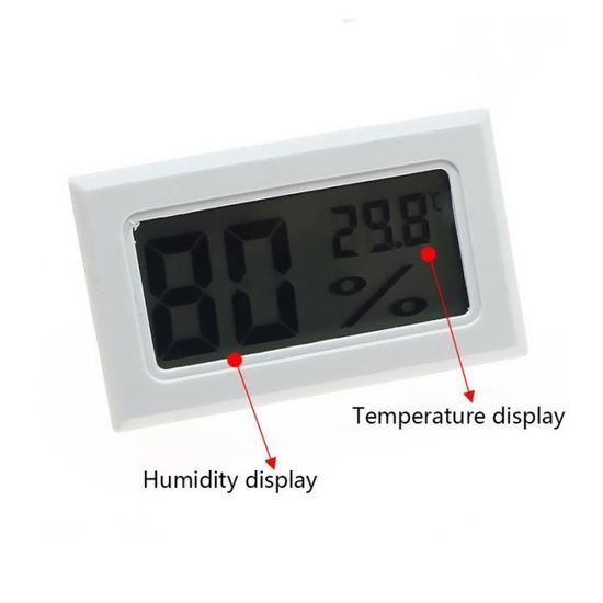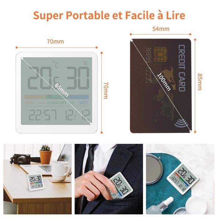 Thermomètre Hygromètre Mini Digital LCD Température Humidité Portable Thermo Indicateur, 3 Pièces Mini cercle LCD Digital Thermomètre Hygromètre, pour Bureau Cuisine Humidors Incubateurs Reptiles Facile à lire : le mini hygromètre numérique dispose d'un grand affichage numérique en temps réel de la température et de l'humidité. Il se met automatiquement à jour toutes les 10 secondes sans réglage manuel et affiche la température confortablement en Fahrenheit ou Celsius Détecteur Air Bureau Maison Lot De 2 Mini Thermomètres Hygromètres Numériques LCD De Forme Ronde Pour La Maison, Le Bureau, La Voiture, Les écoles, Les Hôtels Lot Hygromètres économiques Lot de 8 mini hygromètres numériques ronds - Hygromètre - Température (℉) ou Celsius (℃) - Pour intérieur, bureau, salon et cave à vin (piles incluses) Écran LCD clair et changement °C/°F : écran clair, commutable en °C ou °F au choix via l'interrupteur arrière – Idéal pour les marchés. Description de Lot de 8 mini thermomètres et hygromètres numériques LCD ronds Surveillance précise : Ce thermomètre et hygromètre numérique hautes performances garantit des niveaux précis de température et d'humidité. Idéal pour divers environnements fermés, tels que les congélateurs et les caves à cigares. Large plage de mesure : Le capteur mesure des températures de -10 à 50... Parfait pour les actifs climatiques tels que les humidificateurs ou les déshumidificateurs., à réglementer. Design minuscule et élégant : avec des dimensions compactes (seulement environ 44 × 44 × 15 mm) et sa forme arrondie, l'appareil s'intègre discrètement dans n'importe quel environnement, que ce soit dans le salon, la chambre à coucher, le bureau, la voiture ou la serre. Il garantit toujours un climat intérieur sain, surtout en cas d'air sec ou trop humide. Nombreuses utilisations possibles : cet ensemble d'hygromètre est polyvalent : idéal pour la maison, la maternelle, le laboratoire, l'usine, la cave, le garage, la bibliothèque ou l'hôtel.