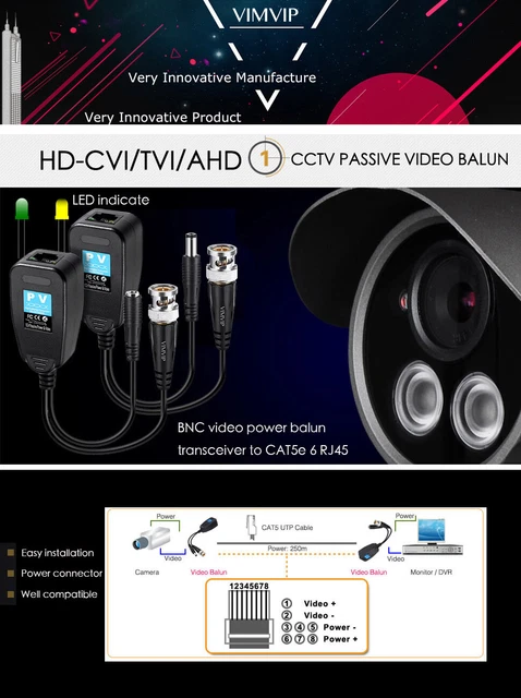 * Formats vidéo NTSC, PAL et SECAM. Balun Passif CVI TVI AHD VIMVIP 2X(Balun VidéO Passif -CVI / TVI / A Avec Connecteur D'Alimentation Et Compatible TVI AHD Balun d'alimentation et vidéo : le BNC plaqué or est fourni avec une meilleure qualité de transmission et un émetteur HD à longue distance. Protection contre les surtensions : 4 KV, ESD : 8 KV., 5., Impédance : BNC-75 Ohms, RJ45-100 Ohms. Matériau : plastique ABS. Applications très étendues : prend en charge tous les appareils vidéo, tels que caméra, moniteur, carte DVR et enregistreur, etc. Dahua PFM800B-4K Mini Balun Transformateur Vidéo Passif 4K Uhd CCTV UTP Hd Cviahdhd Tvipal 35150161 Caractéristiques : * Compatible avec tous les HD-CVI, HD-TVI, HD-AHD. * diaphonie de 60 dB et immunité au bruit. * Vidéo jusqu'à 250 m pour caméras TVI 720p/1080p. Dimensions : 52 x 28 x 21 mm avec câble de 14 cm. Compatible avec tous les appareils photo numériques CVI, TVI et AHD. Balun vidéo UTP torsadé, Distance 300M, 2 pièces, ... – Grandado Balun Vidéo, Balun Vidéo Passif 8MP BNC HD Balun Vidéo Paire... Cet émetteur-récepteur vidéo permet la transmission de vidéo CCTV et de basse tension sur un câble UTP - L'alimentation et la vidéo sont acheminées via des connexions UTP et RJ45., Son rejet d'interférences inégalé et ses faibles émissions permettent aux signaux vidéo de coexister dans le même faisceau de fil que les circuits d'alimentation de téléphone, de données, ou de basse tension. * Vidéo jusqu'à 450 m pour les caméras CVI 720p. * Taille compacte et installation facile. Cet émetteur-récepteur vidéo avec alimentation est un appareil passif (non amplifié) qui permet la transmission de la vidéo monochrome ou couleur en temps réel sur un fil téléphonique non blindé à paire torsadée (UTP).