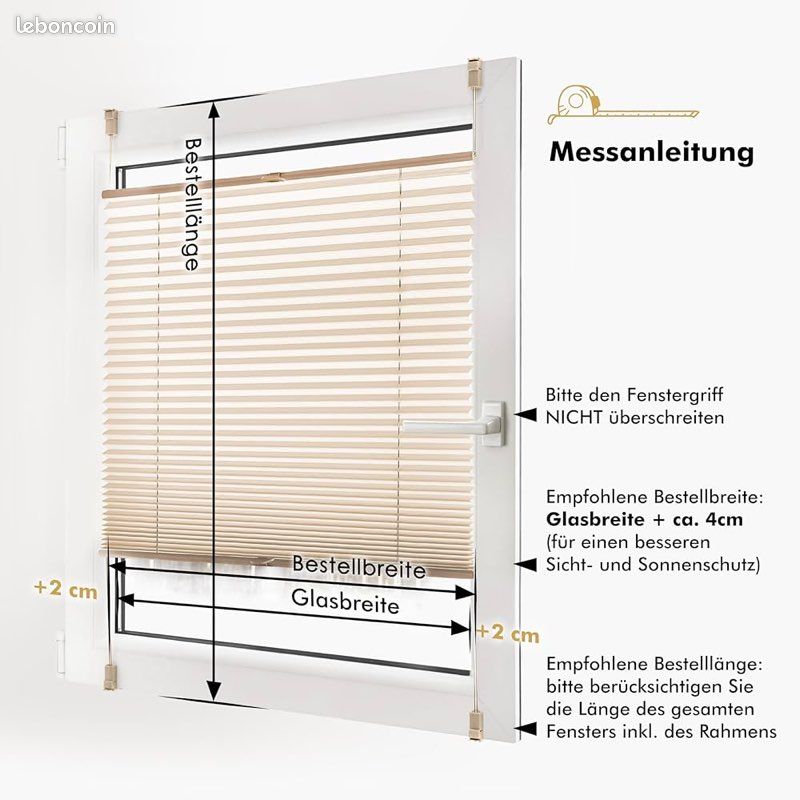 Ils sont parfaits pour le salon, la salle à manger, le bureau et d’autres pièces. ☀️Méthode d'installation : Fixation sans perçage. ☀️ 【Matériau de Haute Qualité】: Les pinces plissées sont fabriquées en plastique et en métal de haute qualité, sont robustes, durables, difficiles à endommager et à décoller, ne se décolorent pas facilement et ne se déforment pas. En un tour de main, votre nouveau store plissé à pince se fixe sans perçage. Applications larges : Ces stores peuvent être utilisés dans votre cuisine, chambre à coucher, salle détude, salon, salle à manger, buanderie, salle de bain, chambre de bébé, jardin, bureau, café-bar, hôtel, dortoir, appartement, supermarché, restaurant et... ☀️ 【Produits Personnalisés】: Nos produits prennent en charge la taille de personnalisation. ☀️ 【Protection Visuelle Optimale】: Celles-ci vous offrent une protection visuelle optimale grâce au tissu plissé crêpé opaque. Klemfix Store Plissé Occultant sans Perçage 45 x 180 cm, Isolation... Il peut être installé dans n’importe quel endroit qui a besoin de bloquer le soleil et de protéger votre vie privée. ☀️ 【Montage Sans Percer Ni Visser】: Le store plissé est facile à installer, à retirer et à utiliser. Store Occultant Opaque Klemfix Store Plissé Occultant Sans Perçage 50 X 75 Cm Store Pour Location Ou Temporaire Nous allons vous répondre plus vite possible. ☀️Design intérieur : les stores sont très adaptés comme décoration de fenêtre élégante, car ils ont une variété de couleurs et de caractéristiques textiles. Nous vous fournirons un service de qualité. ☀️ 【Service Apres Vente】: Si vous recevez un produit endommagé ou celui avec des pièces manquantes, n'hésitez pas à nous contacter, s'il vous plaît ! Poussez et tirez la poignée pour ajuster le store plissé vers le haut ou le bas pendant l'utilisation. Si vous avez des questions sur ce rideau d'ombrage, n'hésitez pas à nous contacter à tout moment. Choix idéal comme traitement temporaire de fenêtre. ☀️ 【Grand Style】: La combinaison d’un design moderne avec des couleurs riches fait de nos plis en tissu une décoration parfaite pour votre intérieur. ☀️Qualité supérieure : ce rideau plissé est fabriqué en tissu non tissé épais avec un bon effet d'ombrage. Les stores plissés sont une décoration fabuleuse de fenêtre et sont de plus en plus une variante de goût et tout aussi moderne pour les rideaux ou les stores modernes. ⛱️ Une brève description de nos produits pour vous : ☀️Type de produit : rideau plissé ☀️Matériau : 100 % fibres de polyester. Protection de la vie privée, stores bloquant le soleil et les UV pour fenêtres. Store Sur Mesure Fenêtre Estika Store Plissé Sur Mesure - Sans Percer - Klemmfix 8-28mm - Intimité Et Lumière Naturelle Klemmfix 8-28mm Store Grâce à la qualité de fabrication de nos stores plissés, vous obtenez non seulement une protection solaire, mais aussi une finition simple de vos fenêtres et de vos salons.
