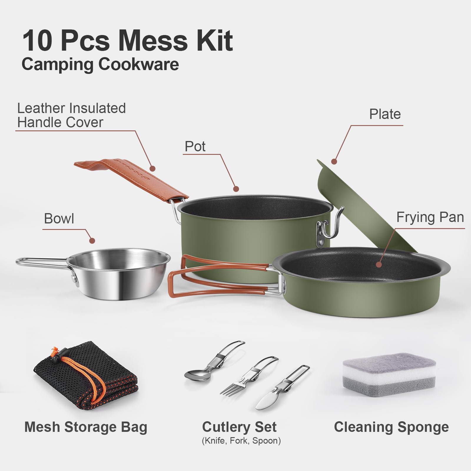 Chaise Camping Odoland Kit De 16 Ustensiles De Cuisine De Camping, Grande Taille à Bol Pliable Couverts Camping Odoland Multi-PCS Kit de Casseroles Camping, Ustensiles de Cuisine À... Couverts Pliants Légers Set De Cuisine Camping Odoland 15 Pièces Veuillez lire attentivement la carte d'entretien du produit fournie avant utilisation. Batterie de cuisine de camping complète : le lot de 10 pièces comprend 1 casserole de 1,3 L, 1 poêle, 1 assiette, 1 bol en acier inoxydable, 1 couvercle de poignée isolé en cuir, 1 sac de rangement en maille, ensemble de couverts en acier inoxydable (1 couteau, 1 fourchette, 1 cuillère) et 1 éponge de nettoyage pour répone à tous vos... Excellent rapport qualité/prix - Le design fin et l'apparence attrayante en font un choix élégant pour toutes vos aventures de camping. Batterie de cuisine de camping complète : le lot de 10 pièces comprend 1 casserole de 1,3 litre, 1 poêle, 1 assiette, 1 bol en acier inoxydable, 1 couvercle de poignée isolé en cuir, 1 sac de rangement en filet, des couverts en acier inoxydable (1 couteau, 1 fourchette, 1 cuillère) et 1 éponge de nettoyage pour répondre à tous vos besoins de cuisine en plein air. Revêtement antiadhésif en céramique : la poêle de cet ensemble de batterie de cuisine est dotée d'un revêtement antiadhésif en céramique sûr et non toxique qui garantit que rien ne brûle. La poignée en cuir offre une prise en main confortable, résistante aux hautes températures et sûre.