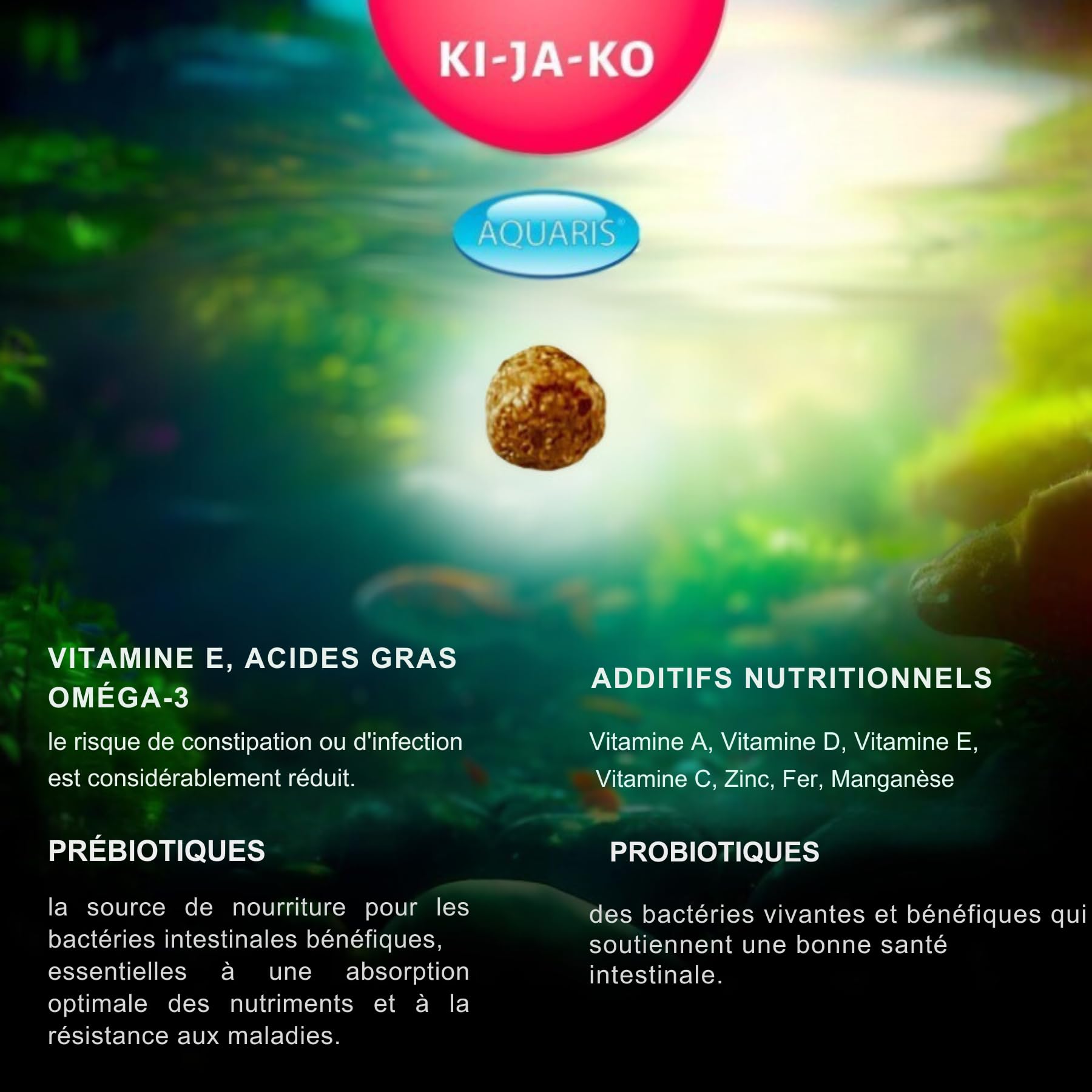 À partir de quand les Kois devraient-ils être nourris au printemps Les carpes Koï sont des animaux à sang froid. En général, une alimentation en hiver n'est donc pas nécessaire. Vers De Farine Pour Poules Omega 3 Développement Nourriture Pour Alevins Carpe Koï KI-JA-KO 500g - 2mm Avec Probiotiques Et Oméga-3 - Croissance Optimale Granulés Riches Protéines Baby Bio Dès le début, cela soutient la coloration intense et naturelle des jeunes Kois. ● Haute teneur en protéines , ● Granulés de 2 mm Coloration naturelle intense : Grâce à des ingrédients naturels comme l’astaxanthine et le poivron, cette nourriture pour carpes koï stimule les pigments naturels et assure une intensité de couleur optimale dès les premières semaines de vie. La haute qualité de la nourriture pour Koï KI-JA-KO assure une digestion optimale, réduisant ainsi les excréments des poissons et donc la charge sur l'eau. La promesse de qualité de la nourriture pour Koï KI-JA-KO Avec la nourriture pour Koï KI-JA-KO, vous êtes toujours sûr de faire le bon choix. Nourriture complète pour alevins de carpe koï : KI-JA-KO Baby est une alimentation spécialement conçue pour favoriser une croissance rapide, un développement harmonieux et une vitalité accrue dès le plus jeune âge. ● Avec FORPLUS (algues riches en oméga-3) En fin de compte, une alimentation appropriée réduira généralement la fréquence des maladies chez vos carpes koï. En particulier, ce dernier point est très important en raison des coûts d'acquisition élevés des carpes koï Nishikigoi particulièrement nobles en provenance du Japon, de sorte qu'une bonne nourriture pour koï peut souvent être un choix plus économique en pratique. Le meilleur aliment pour les Kois dans ce cas est le KI-JA-KO Health. Même si le prix peut être un peu plus élevé, l'achat d'une nourriture pour Koï de qualité supérieure avec un poids spécifique élevé et des ingrédients précieux, tels que la spiruline, en vaut la peine à plusieurs égards. Gestion des alevins en aquarium : conseils et techniques Par conséquent, le meilleur aliment pour les Kois durant ces périodes est le KI-JA-KO Whetgerm. ● Avec des acides organiques et du krill , ● Avec BIO-MOS Il contient également des prébiotiques et des probiotiques. Le moment exact où vous pouvez commencer à nourrir vos poissons au printemps dépend de la température de l'eau. Il appuie les réactions de défense naturelles du corps et maintient et protège le système immunitaire naturel. Idéalement, les poissons devraient être nourris à midi, car c'est à ce moment-là que les températures sont les plus élevées et que les carpes Koï sont donc les plus actives. Au plus tard au deuxième coup d'œil, il devient rapidement évident que les coûts supplémentaires par rapport à la nourriture discount sont à peine remarquables. Nourriture pour alevins : Bientôt une fabrique d’aliments de poisson à... La quantité de nourriture doit être choisie de sorte que tout soit mangé dans les 20 minutes. ● Contient des fibres prébiotiques et de l'inuline Les étangs se réchauffent rapidement en automne et au printemps, mais se refroidissent tout aussi rapidement. Les matières premières utilisées pour toutes les nourritures pour Koï KI-JA-KO sont soigneusement sélectionnées et répondent aux normes de qualité les plus élevées. À environ huit degrés, les poissons peuvent digérer la nourriture. La nourriture doit être entièrement consommée dans les cinq minutes. Toutes les variétés ont été spécialement développées pour répondre aux exigences particulières de l'alimentation des Koïs, garantissant ainsi une croissance saine et des couleurs éclatantes. Même avec des systèmes de filtration performants, la qualité de l'eau peut en souffrir et le risque de problèmes de santé peut augmenter considérablement. Les probiotiques, constitués de bactéries positives, et les prébiotiques, source de nourriture pour ces bactéries, contribuent à neutraliser les bactéries pathogènes et à favoriser une bonne absorption nutritionnelle. ● Contient du paprika et de l'astaxanthine Nourriture pour carpe koï - Koi Energy Menu - 3L