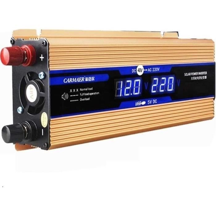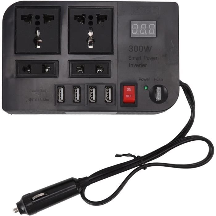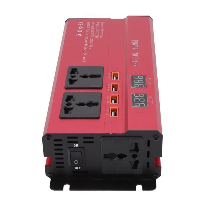 Sécurité Optimale et Fiabilité à Long Terme La tranquillité d'esprit est garantie. Compatibilité Universelle et Installation Aisée Sa polyvalence est un atout majeur. Onduleur Voiture 12V 220V Convertisseur Voiture Onduleur DC 12/24V Vers AC 220V Avec Conception Convertisseur Camping Road Trip Convertisseur de tension solaire pour voiture, onduleur 12V/24V à 220V... Compatible avec la plupart des véhicules (systèmes 12V et 24V), cet onduleur s'installe instantanément sans aucune modification requise. Attributs du produit Nom du produit: onduleur de voiture Poids: 235g Taille du produit: environ 10x5,5x2,5 cm / 3,94x2., 17x0,98 pouces Matériel: PC + ABS Sortie USB: 5V-2., 4A Type-C: 5V-2., 4A Tension d'entrée: 10-28v Courant d'entrée: 5-10A Tension de sortie: DC110V-220V Courant de sortie: 0,6-1., 1a Puissance de sortie continue: 60W / 80W / 100W / 150W Conseils chauds: 1., En raison de la température de couleur de l'affichage, de la caméra, de la lumière ambiante et des compétences en photographie, les de certains produits peuvent avoir une légère différence de couleur et la couleur est soumise au produit réel!, 2., En raison de différentes mesures manuelles, veuillez permettre de légères différences de taille. Idéal pour recharger rapidement un ordinateur portable et un smartphone en même temps pendant vos déplacements. Connexion Double Appareils: Deux ports conçus pour une utilisation multi-appareils boostent l'utilisation et s'adaptent aux besoins énergétiques différents pour des performances fiables à tout moment Doté de deux ports, il alimente facilement deux appareils à la fois, répondant à divers besoins en énergie. Performance Intelligente et Charge Rapide Notre onduleur se distingue par son intelligence de pointe. Sécurité Thermique : de température avancée et mécanisme de refroidissement intégré maintiennent des conditions de fonctionnement optimales. Associée à une méthode de charge innovante, elle réduit considérablement le temps de recharge de tous vos appareils, même lors d'une utilisation simultanée. FINE-Onduleur 12V à 220V 2000W Onduleur à Onde Sinusoïdale Modifiée... Une solution plug-and-play parfaite pour un usage quotidien en voiture, que vous soyez professionnel itinérant ou en voyage familial. Protection des appareils pour une durabilité étendue. Une puce intelligente optimise la conversion d'énergie pour une efficacité maximale et gère la distribution du courant. Convertisseur Pur Sinus Onduleur de voiture LCD 3000W DC 12V/24V à AC