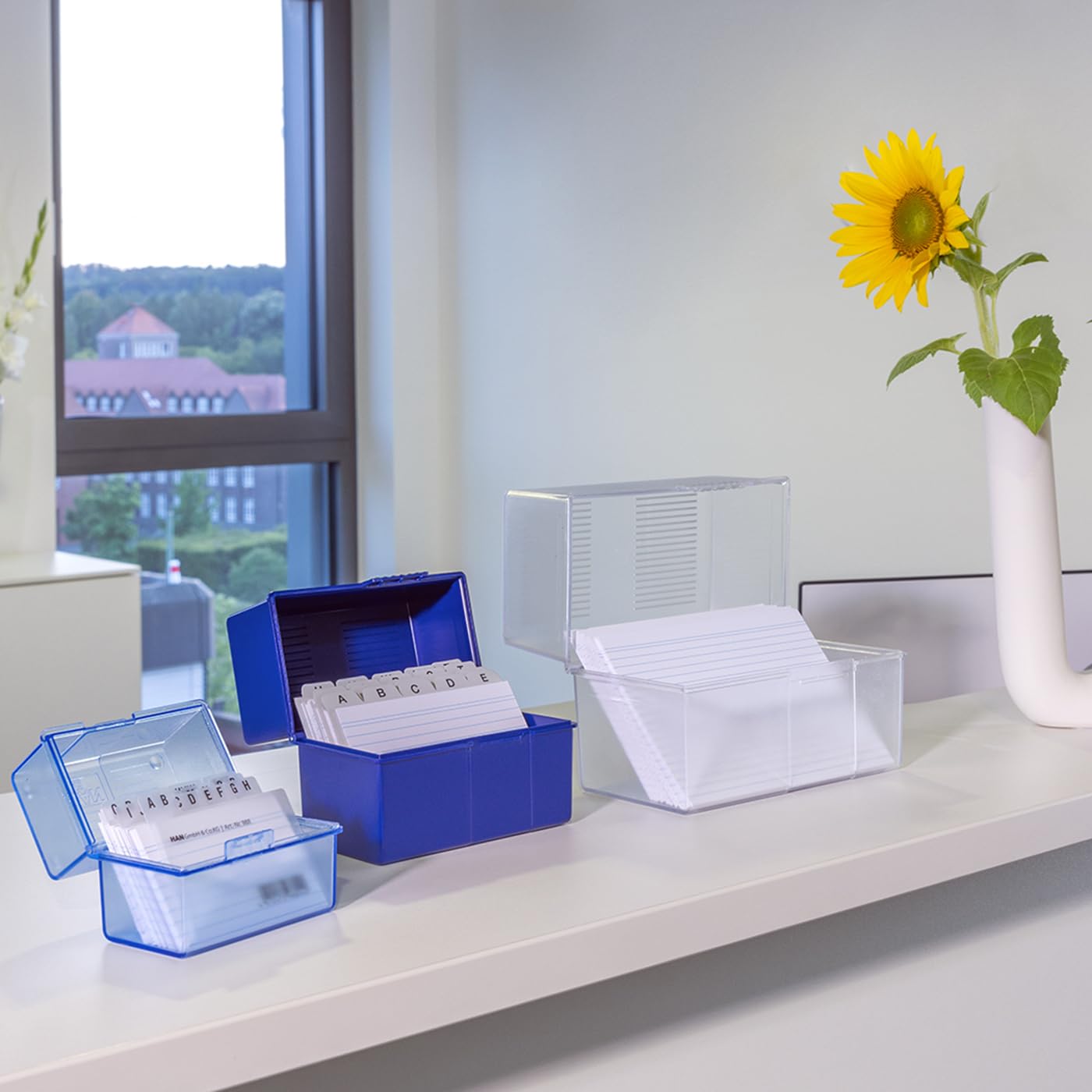 Stock Bureau - HAN Boîte à fiches pour 300 cartes A7 paysage Livrée Bureau HAN contemporain de l'élégance | Agencement pro Bureaux de... Han 977-11 Organiseur De Bureau | Black Friday Organiseur Bureau Couvercle Bac Fichier format DIN A7 horizon., , pour 300 fiches max., ., Le partenaire idéal pour le rangement dans le bureau et durant les déplacements. (L x P x H): 121 x 74 x 101 mm. Organiseur de bureau bleu - HAN Re-X-LOOP 17238-914 - 4 compartiments... Exécution de haute qualité avec charnières en acier et fermeture à clip. Finition de très haute qualité avec charnières en acier et fermeture encliqueta blé. Capacité: de 220 fiches (190g/m²) à 300 fiches (100g/m²) max., ., Utilisable pour format de fiches: DIN A7 horizontal., Livré sans contenu. A son ouverture, le couvercle se rabat complètement à l'arrière, servant ainsi de bac à fiches supplémentaire.