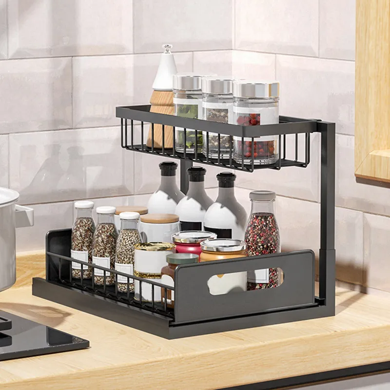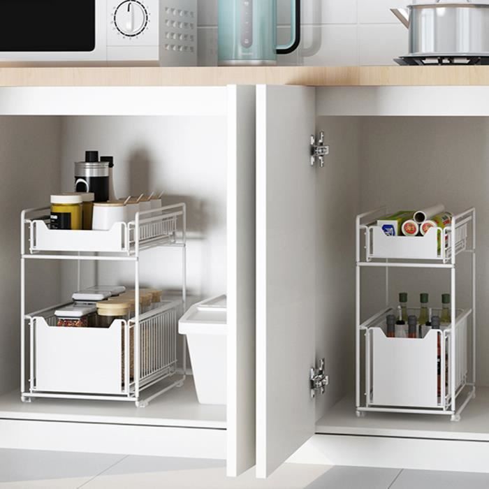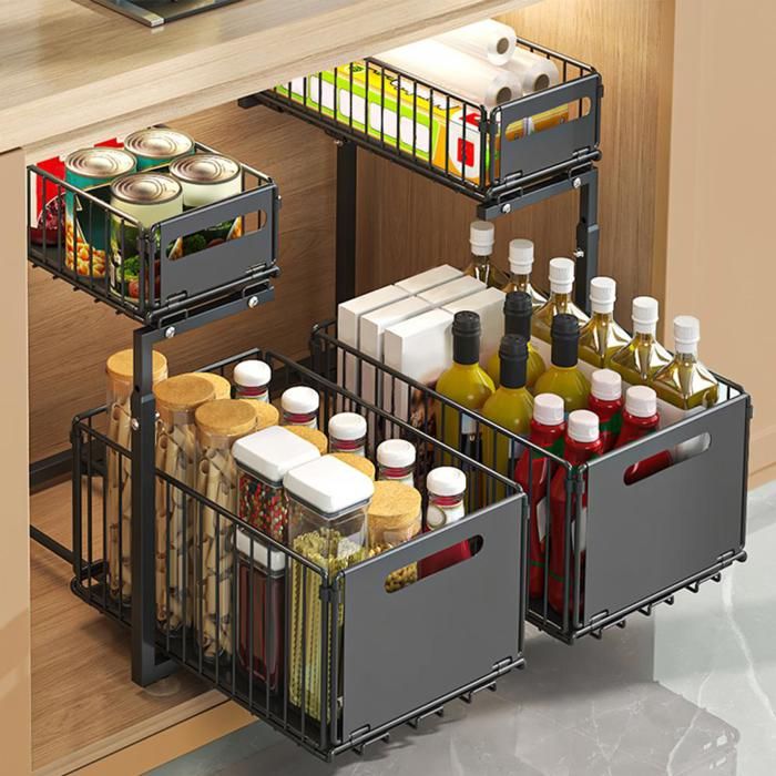 Panier Coulissant Pour Placard Organiseur Sous évier à 2 Niveaux, Coulissant Sous Armoire De Salle De Bain, Tiroir De Rangement Sous évier Promo Organisateur sous évier à 2 niveaux avec tiroir 40 x 22 x 32 cm chez Kandy Pour seulement 8,88 €, l’organisateur sous-évier d’Action à deux niveaux avec un tiroir coulissant permet enfin de garder ses produits bien rangés et accessibles Caractéristiques : Nom : étagères coulissantes doubles., Couleur : noir. Dimensions du produit : environ 40 x 21,5 x 37 cm. Matériau : polypropylène. Polyvalent pour la cuisine et la salle de bain, l'organisateur sous évier permet également un séchage rapide des articles humides. Contenu : 1 organiseur sous évier de salle de bain., 4 crochets., 1 tasse à suspendre La couche supérieure est pour les petits articles et condiments, tandis que la couche inférieure peut accueillir des bouteilles et des brosses plus grandes. Les trous de drainage assurent un séchage rapide pour les articles mouillés, tandis que les crochets inclus offrent un espace de rangement supplémentaire. Utilisation optimale de l'espace : Conçu pour s'intégrer parfaitement sous n'importe quel évier, cet organisateur à 2 niveaux optimise l'espace inutilisé. Sa structure compacte est idéale pour ranger les produits d'entretien, les articles de toilette ou autres, ce qui en fait une solution polyvalente pour désencombrer les petits espaces