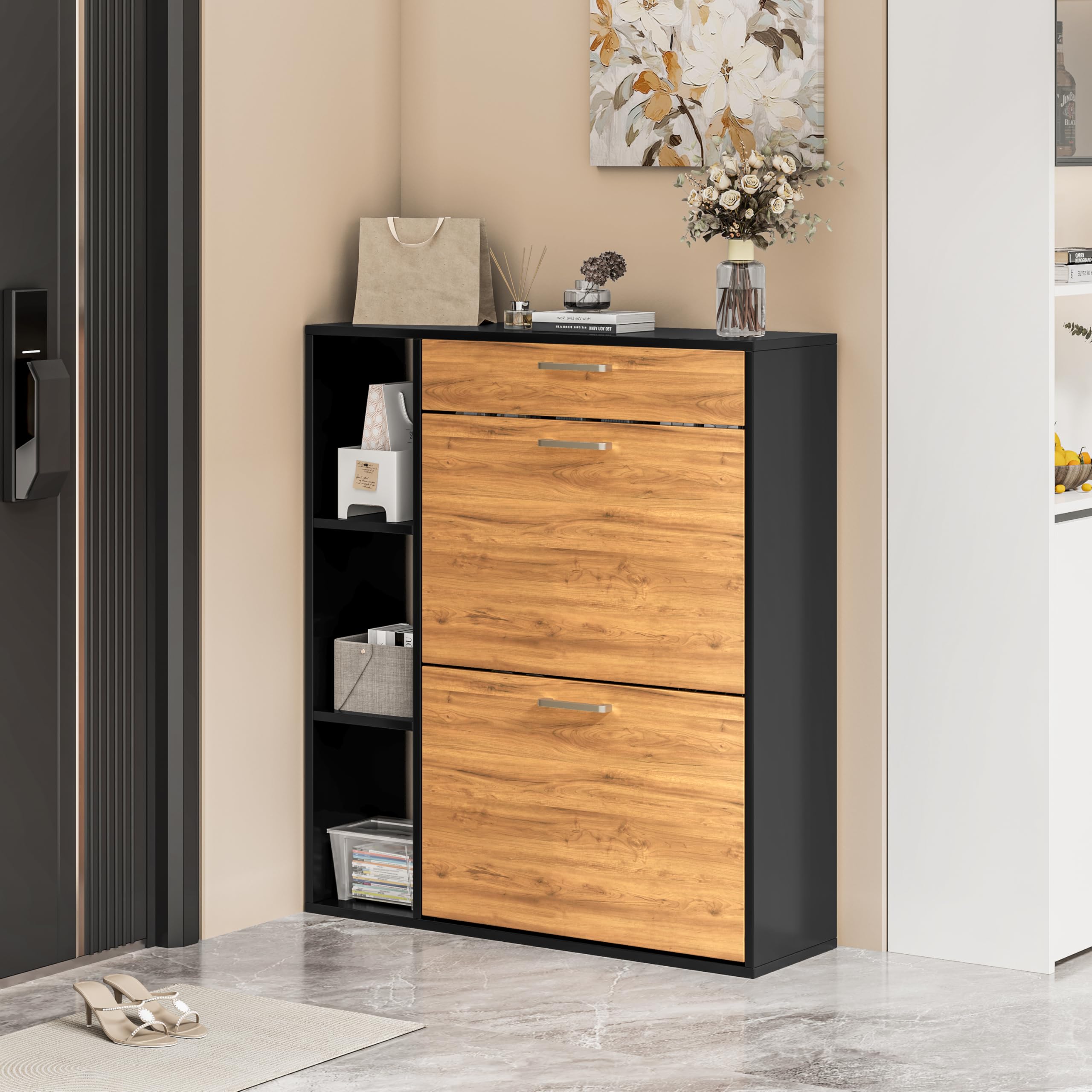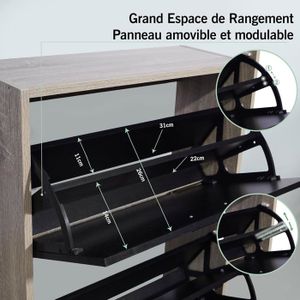 Rangement pratique : Mesurant 80 x 24 x 90 cm, ce meuble peut accueillir de 12 à 16 paires de chaussures. Design élégant : Ce meuble à chaussures sur pied convient aux chambres, salons, couloirs et entrées. Haute qualité : Fabriqué en panneaux de particules E1 avec revêtement résistant à l'eau. Avec son grand espace de rangement, une seule armoire crée de l'ordre dans les chaussures en désordre. ZORZA Meuble de Rangement a Chaussure à 3 Tiroirs pour 27 Paires, Blanc Extra Fin Bois Meuble Chaussure - Armoire Etagere Grande Capacité pour Entree, Couloir Meuble à chaussures inclinable et peu encombrant : Grand espace de rangement grâce à deux étagères à chaussures pliables pouvant accueillir de 12 à 16 paires de chaussures. Les séparateurs réglables et amovibles facilitent le rangement d'objets plus volumineux ou de chaussures. Rangement pratique : Mesurant 80 x 24 x 122 cm, ce meuble à chaussures peut accueillir de 18 à 24 paires de chaussures. La partie supérieure offre un espace... Excellent service client : Notre équipe du service client vous aidera rapidement en cas de problème. Disponible en blanc et en noir et orange contrastants, il permet non seulement d'organiser les chaussures, mais aussi de ranger sacs, accessoires, etc. Disponible en blanc et en noir et orange contrastants, il permet non seulement d'organiser les chaussures, mais aussi de ranger sacs, accessoires et autres articles. Meuble A Chaussures 12 Paires Organize Meuble De Rangement A Chaussure 12 Paires - Armoire Etagere Grande Capacité Pour Entree, Couloir - MDF Style Bois - L60xP24xH80 Cm - Blanc Meubles Chaussures Rangement pratique : Mesurant 80 x 24 x 90 cm, ce meuble peut accueillir de 12 à 16 paires de chaussures. · Meuble à chaussures inclinable et peu encombrant Instructions de montage détaillées et pièces numérotées pour un montage simplifié.