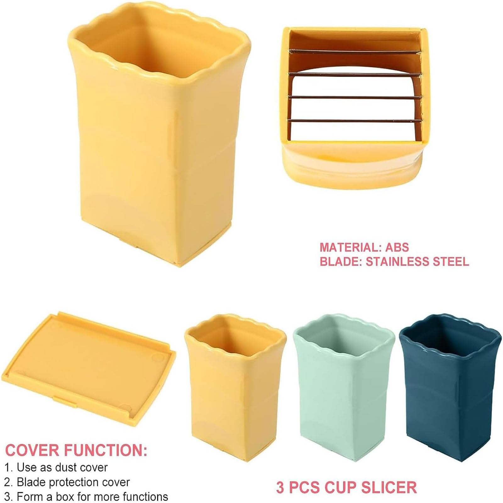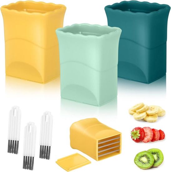 Trancheuse Fraise Banane Acier STOUCLA Couteau à Découper Les Fruits En Acier Inoxydable, Outil à Découpe, Trancheuse à Fruits Et Légumes De Forme Triangulaire, Trancheuse à Couteaux à Légumes Pour Fruits Et Légumes Kit 3 Coupe-fruits Cuisine Coupe-mange Découpe mangue Trancheuse fruits Coupe-fruits Dénoyauteur mangue nouveau] Coupe-trancheuse De Fruits En Forme De Tasse, Trancheuse De Fruits Et œufs, Découpe-bananes Et Fraises En Acier Inoxydable, Pour Couper Rapidement Les... Matériau premium: Notre fruit de fruits de fraises est en plastique et en acier inoxydable. Il peut facilement couper les fruits et légumes en formes uniformes Contenu du produit: Notre ensemble comprend 3 morceaux de trancheuse de fruits en acier inoxydable. Spécifications: Matériau: plastique et acier inoxydable Couleur: jaune, vert, bleu foncé Taille: 8,5 x 6 x 4,5 cm Contenu de l'emballage: 3 coupe-fruits Conseils chaleureux: 1., Mesure manuelle, veuillez prévoir de légères erreurs de taille., 2., En raison des différents équipements de prise de vue et de la lumière, il peut y avoir une légère différence de couleur entre le produit et les images. La quantité abondante garantit que vous avez toujours une trancheuse prête à être utilisée et remplacée dans votre cuisine Application large: idéal pour couper divers fruits et légumes, la trancheuse multifonctionnelle est parfaite pour une utilisation intérieure et extérieure, offrant une commodité et une polyvalence pour tout besoin culinaire Facile à stocker: compact et économe en espace, les coupeurs de fruits peuvent être facilement stockés dans un tiroir de cuisine, sur le comptoir ou accroché sur un stand de cuisine, en gardant votre cuisine organisée et sans encombrement La lame en acier inoxydable est tranchante et durable. Le corps en plastique alimentaire (jaune, vert, bleu foncé) est ergonomique et facile à tenir. Chaque...