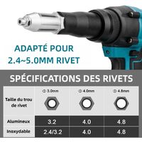 Riveteuse Compatible 2.4mm 4mm 4.76mm Outil Riveteuse Manuelle Pince à Riveter BGS DIY 401 - 4 Embouts Pour Rivets 2.4 à 4.8mm Avec Coffret Outillage Rivetage Outil Rivetage Sans Fil Outil de rivetage - YWEI - blue B - 2.4mm 4.8mm - avec adaptateur de OUTIL DE RIVETAGE électrique sans fil écrou portable avec batterie... 【Moteur sans Balais Électronique】: Équipée d’un moteur sans balais haute performance, cette riveteuse fonctionne sans étincelles et ne nécessite aucun remplacement de balais de carbone. Elle offre une efficacité accrue, une consommation d’énergie réduite jusqu’à 80 %, un fonctionnement plus silencieux, et une durée de vie prolongée. 【Changement de Mode】: Conception à bouton unique, permettant de basculer facilement entre trois modes de fonctionnement : pousser à gauche pour la rotation avant (mode rivetage), position centrale pour le mode verrouillage, pousser à droite pour la rotation arrière (mode retrait de rivet). Grâce à sa grande compatibilité, elle convient aussi bien aux travaux de réparation mécanique qu’aux rénovations domestiques ou aux projets DIY. Simple et facile à utiliser, idéal pour réaliser rapidement le rivetage, la coupe et la rétraction des rivets. 【Fonctionnalités Améliorées】: Conçue pour plus de praticité, elle intègre une lampe qui éclaire efficacement les zones sombres ou difficiles d’accès. Livrée avec deux batteries rechargeables de 1300 mAh, elle offre jusqu’à 1 heure d’autonomie continue. Ensemble d'outils de rivets électriques Ensemble d'outils de rivetage...
