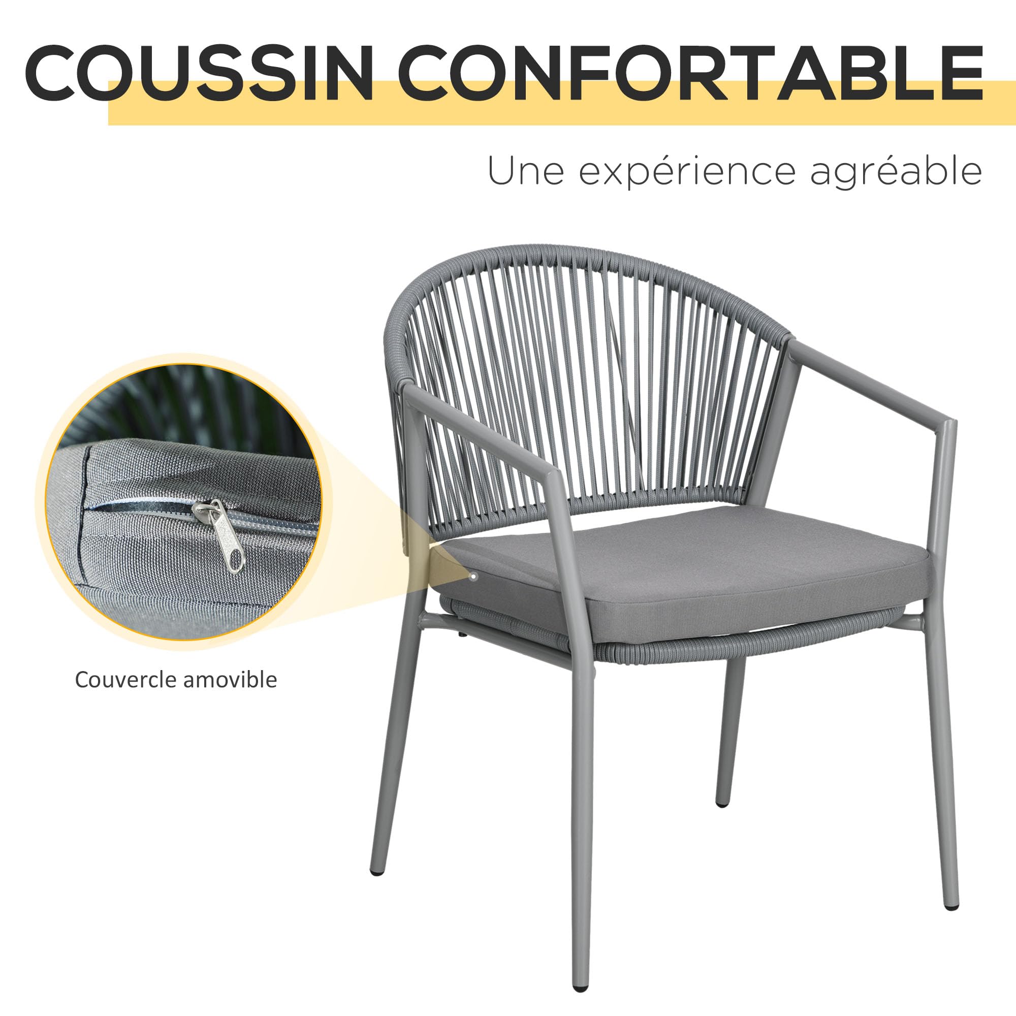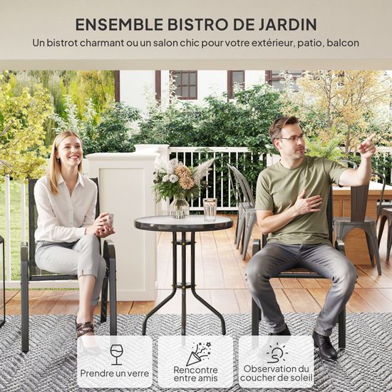Ne laissez plus passer les beaux jours sans profiter pleinement de votre espace extérieur grâce à cet ensemble bistro de jardin. Salon de jardin 4 personnes - OUTSUNNY - Design style yachting - Acier ENSEMBLE COMPLET ET POLYVALENT : Profitez de deux fauteuils et d'une table basse ronde avec ce salon de jardin, parfait pour se détendre ou partager un moment convivial dans tout espace extérieur, même les petits jardins ou patios Fauteuil Jardin Outsunny Ensemble Bistrot Pour Jardin En Aluminium Salon De Jardin 3 Pièces 2 Chaises + 1 Table Ronde Imitation Fer Forgé Vert Table Exterieur Avec Chaise Imaginez-vous savourer un café sur ses 2 fauteuils confortables et sa table basse élégante. chaises : 57L x 68l x 88H cm● Dim. Outsunny - Ensemble bistrot de jardin relax 2 personnes 3 pièces... 50 kg (table), 120 kg (fauteuil). recommandée : 50 kg (table), 120 kg (chaise)● Réf. Ensemble complet de bistro de jardin: Cet ensemble se compose de deux chaises élégantes avec un design unique et creusé de coquille et une table qui s'y adapte, idéal pour tous les types de meubles de jardin ou de balcon. Durabilité garantie: Fabriqué en acier robuste, résistant à l'eau et à l'rouille, ce set de bistro offre une durabilité et des performances exceptionnelles. Les... coussin d'assise : 47L x 47l x 5H cm● Charge max. table : Ø48 x 45H cm● Dim. STYLE MODERNE POUR VOTRE EXTÉRIEUR : Ce salon de jardin 3 pièces séduit par son design élégant et sa structure en corde tressée, ajoutant une touche originale à votre terrasse ou balcon Descriptions Longues:Transformez votre terrasse en un havre de détente avec ce salon de jardin contemporain. SÉCURITÉ ET STABILITÉ RENFORCÉES : Ce salon de jardin est équipé de patins antidérapants sur les fauteuils et de patins réglables sur la table basse, assurant stabilité même sur des surfaces inégales