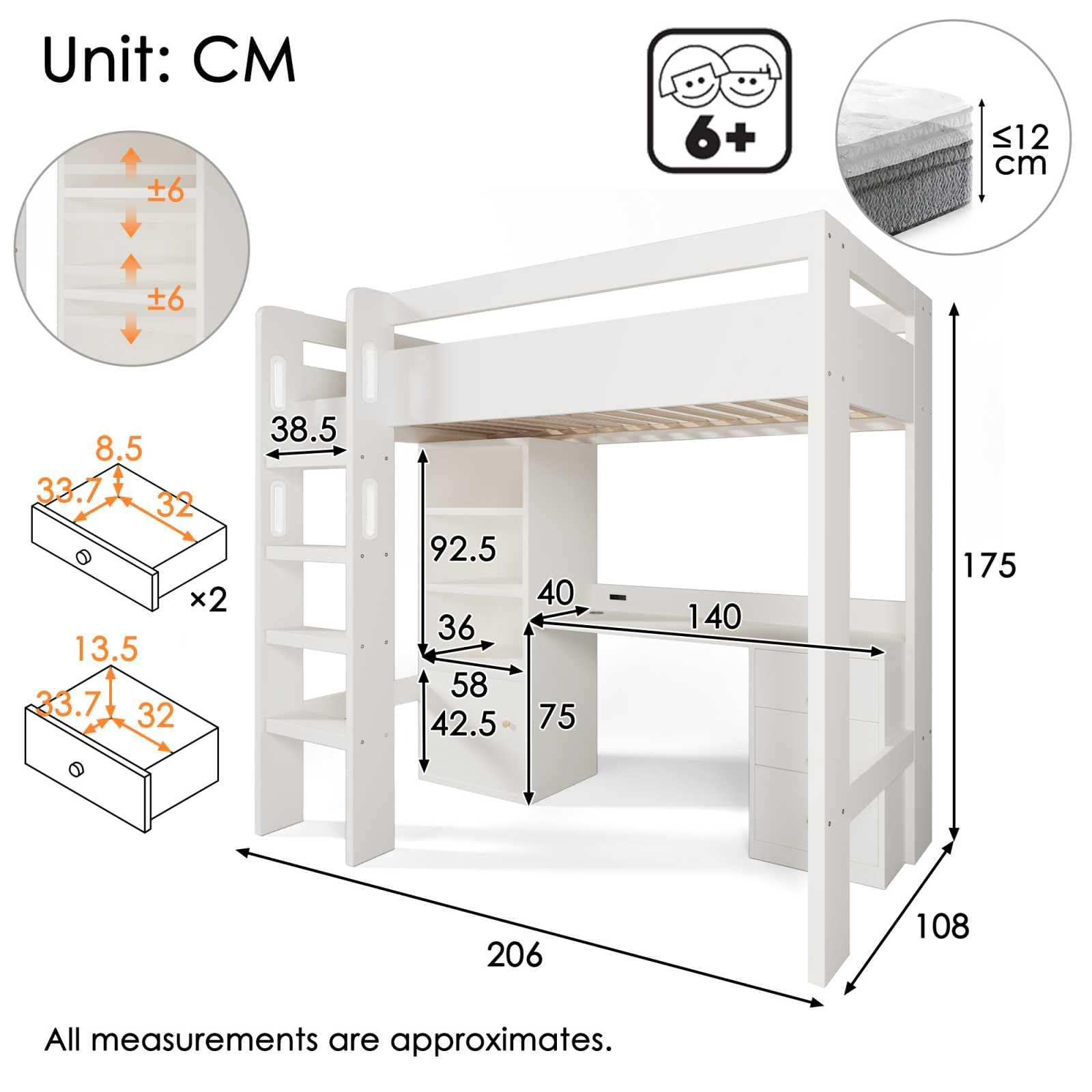 La combinaison de ces deux matériaux renforce non seulement la durabilité du lit, mais offre également un environnement de sommeil sûr et stable. Espace de rangement suffisant : la conception unique de l'échelle et des tiroirs de rangement permet d'exploiter chaque centimètre carré d'espace pour ranger les vêtements,les jouets et autres articles quotidiens, contribuant ainsi à maintenir la chambre propre et bien rangée. Lit Mezzanine 90x200 YEHTOKHOME Lit Superposé Moderne De 90 X 200 Cm Avec étagères Ouvertes Et Escalier, Simple Lit En Bois Avec Garde-Corps Et Sommier à Lattes(sans Matelas) (Blanc 2 Lit Sécurisé Pour Enfants Lit enfant 90x200cm avec échelle et tiroirs de rangement - Aapaas... L'échelle de rangement est spacieuse et stable, ce qui permet aux enfants de monter et descendre facilement du lit. Il s'agit d'un meuble à la fois élégant et pratique. Description + dimensions : Dimensions totales du produit : 240 x 205 x 163 cm Dimensions détaillées du produit : veuillez vous référer à l'image des dimensions Type de produit : lit combiné Type de matelas : sans matelas Matériaux : pin + panneaux de fibres à densité moyenne Dimensions : 90 x 200 cm Couleur : blanc Poids total du produit : 120 kg Capacité de charge : 100 kg Épaisseur de matelas recommandée (matelas non inclus) : 10 cm Nombre de colis : 5 Assemblage requis : oui Remarque : 1., Toutes les dimensions sont approximatives., 2., En raison des mesures manuelles,il peut y avoir une erreur de 2 à 3 cm., 3., En raison de la lumière, il peut y avoir une différence de couleur entre la photo du produit et l'objet réel, veuillez vous référer à l'objet réel reçu., 4., Si les clients rencontrent des problèmes pendant le processus d'installation,veuillez nous contacter dès que possible. Nous vous remercions de votre patience. La conception solide de la barrière de sécurité améliore non seulement la sécurité, mais aussi l'esthétique générale. L'échelle de rangement et les tiroirs sont astucieusement conçus pour exploiter chaque centimètre carré d'espace et permettre de ranger les vêtements, les jouets et autres articles de tous les jours, contribuant ainsi à maintenir la chambre propre et bien rangée. Chaque lit peut supporter un poids maximal de 100 kg et peut facilement accueillir trois personnes, répondant ainsi aux besoins de sommeil des familles nombreuses. La finition blanche s'harmonise avec tous les styles de décoration intérieure et donne une impression de fraîcheur et de modernité. Lit superposé 90x200cm, lit cabane enfant avec escalier et 1x sommier à... Le cadre en pin offre un soutien solide, tandis que les panneaux de fibres à densité moyenne renforcent l'esthétique et la fonctionnalité de l'ensemble. Ce produit sera expédié en 5 colis qui peuvent ne pas arriver en même temps. Le lit superposé est équipé d'une barrière de sécurité solide qui empêche efficacement les enfants de tomber accidentellement lorsqu'ils se retournent pendant la nuit, offrant ainsi une sécurité supplémentaire. Lit mezzanine 90 x 200 cm avec bureau + 2 tiroirs - Armoir avec porte