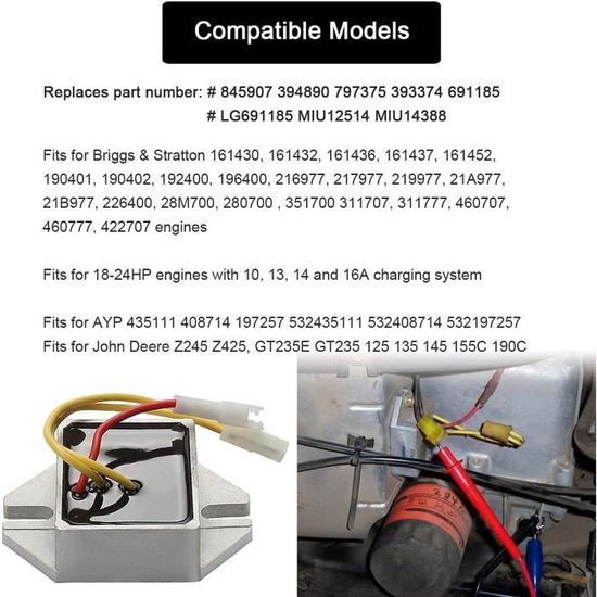Régulateur Tension 16A Pour Tracteur Tondeuse REGULADOR DE VOLTAJE PARA MOTOR BRIGGS & STRATTON 845907 394890 | ARCE REFACCIONES Pièce Moteur Tondeuse Compatible Regler Spannungsregler Régulateur Briggs & Stratton 393374 394890 691, 14,90 Régulateur de Voltage de rechange pour Briggs & Stratton 394890 393374 691185 797375 797182 845907 par OxoxO · Commander et payer via · Livraison offerte par... * Remplacement parfait : remplace les numéros de pièce OEM 394890, 691185, 797375, 845907, et les numéros de pièce MIU12514, LG691185., * Performance fiable : ce régulateur de tension assure une sortie de tension stable et constante, offrant une régulation efficace de la puissance et une protection pour votre équipement. Caractéristiques : * Nom du produit : régulateur de tension., Matériau : métal., *Taille : non., *Couleur : non., Compatibilité : 394890, 691185, 797375, 845907., Nombre de pièces : 1., Contenu de l'emballage : 1 régulateur de tension. Compatibilité étendue du modèle : ce régulateur de tension est compatible avec de nombreux modèles tels que 20S202 et 21B902, adapté pour les moteurs nécessitant 16 A, ce qui le rend pour différents besoins. Caractéristiques : *Compatible avec les modèles : ce régulateur de tension est spécialement conçu pour s'adapter aux modèles 192400, 196400, 20B437, 20F437, 20H137, 20H232, 20H237, 20L237, 20M307, 20M337, 20P237, 20P237, 20P237., 437., 20S132, 20S157, 20S202, 20S207, 20S212, 20S217, 20S232, 20S237, 20S252, 20S257, 21A977, 21B417, 21B902, 21B902., 06, 21., B907, 28M700, 280700, 311707, 351700, 445777, et 422447 avec moteurs de 16 A. Remplacement du numéro de pièce OEM : un remplacement fiable pour les numéros de pièce OEM, y compris 394890 et LG691185, assurant la fiabilité de fonctionnement. Facile à remplacer : livré avec un régulateur de tension dans chaque colis pour une installation simple sans les tracas des configurations complexes. Vérifiez la taille de votre modèle : vérifiez toujours la compatibilité avec votre modèle de moteur spécifique avant de procéder à l'achat. Régulateur de tension adaptable sur moteur BRIGGS STRATTON Compatible sur les moteurs de 18 à 20 HP avec alternateur de 10, 13, 14 ou 16 Amp modèles : 28M700, 192400, 196400, 226400, 280700, 351700 En remplacement des références constructeurs : 845907, 394890, 393374, 691185, 797375, 555379