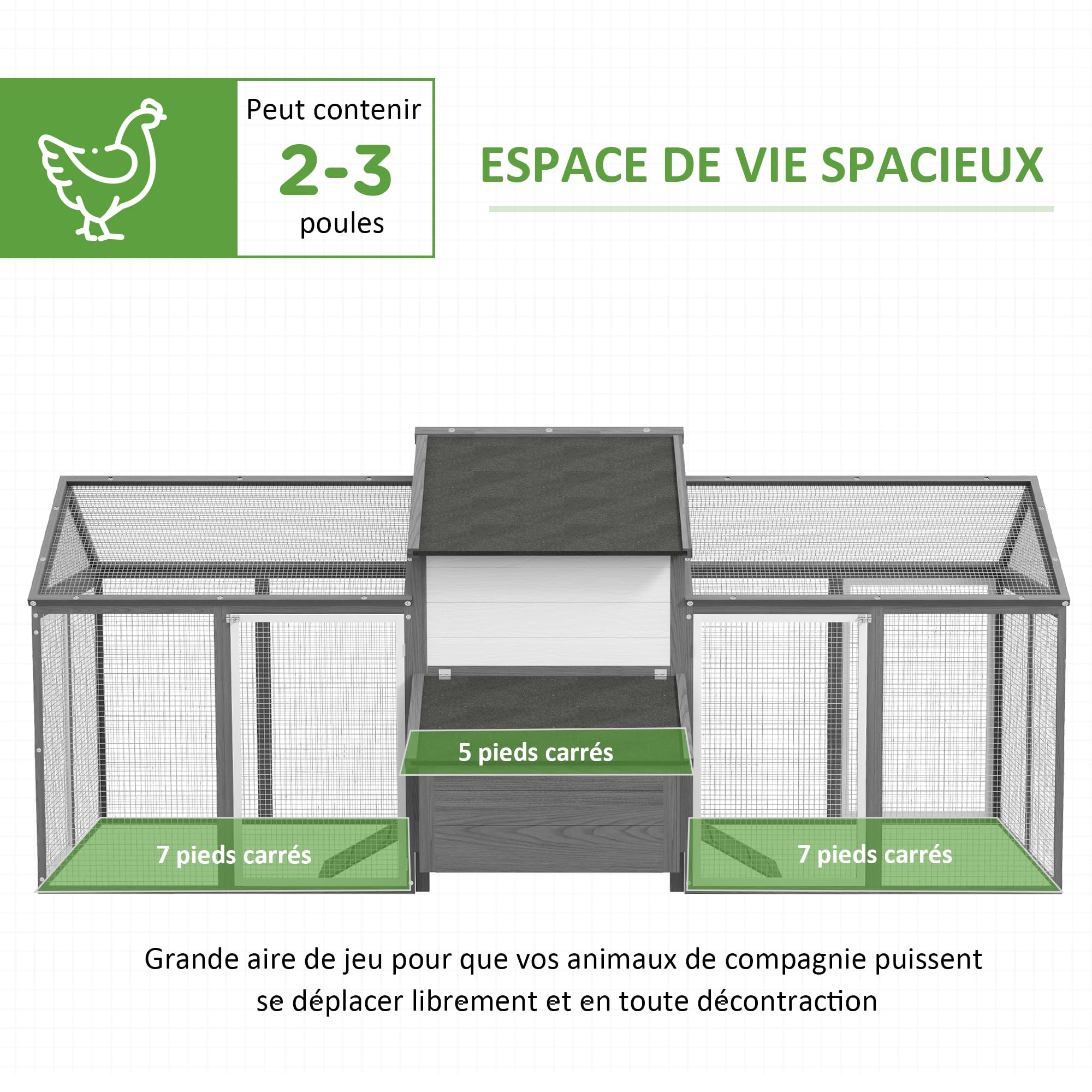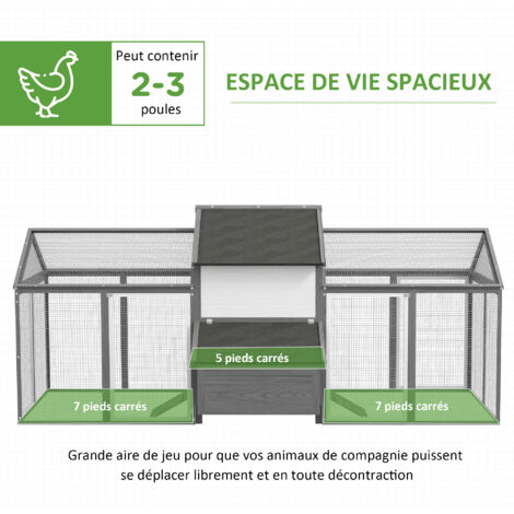 PawHut Poulailler avec enclos poulailler avec bâton en bois massif naturel D51-108 Poulailler Avec Tiroir PAWHUT Poulailler En Bois 2 Enclos Modulables Niche Pondoir Gris Pas Abri Poules Résistant Poulailler 4 Poules Avec Pondoir Poulailler Gris Clair Avec Nichoir & Enclos 144x40x68,5 Cm Bois... CONSTRUCTION ROBUSTE ET RÉSISTANTE : Ce poulailler extra-large est fabriqué en bois de sapin massif peint, avec un toit imperméable et anti-UV pour protéger vos poules des intempéries toute l’année PawHut Grand poulailler en bois 2 nichoirs porte verrouillable rampe d'accès et plateau... ENTRETIEN SIMPLIFIÉ AU QUOTIDIEN : Ce poulailler en bois est équipé d’un plateau coulissant et de portes arrière et latérales pour un nettoyage rapide et un entretien facile de l’intérieur , SPÉCIFICATIONS : Dim. ACCÈS PRATIQUE ET SÉCURITÉ RENFORCÉE : La cage à poule extérieure dispose de rampes pour un accès facile, de portes verrouillables et d’un grillage solide pour garder vos poules en sécurité contre les prédateurs