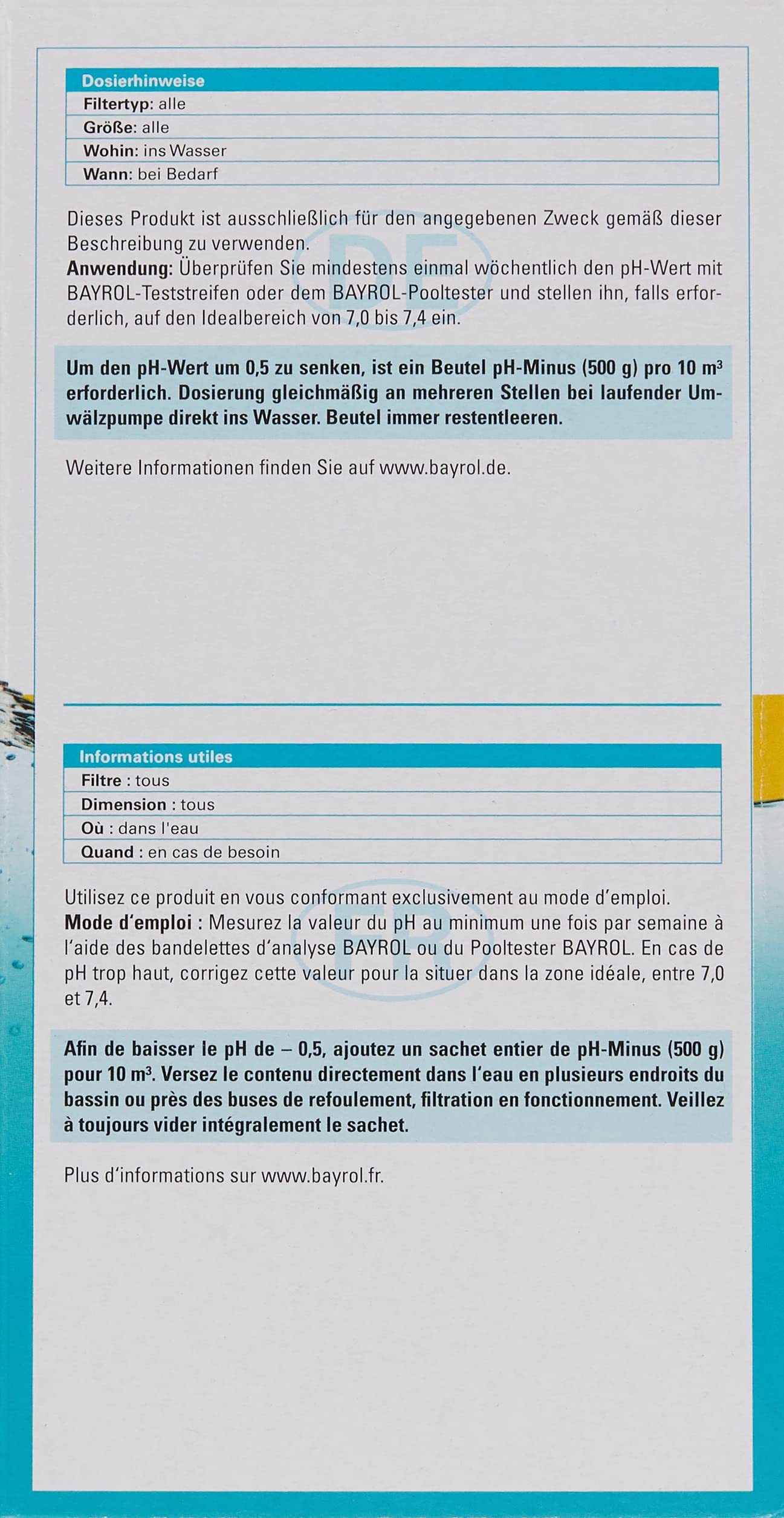 O7-organic Réducteur Ph- 5 L. Booster pour Piscines et Spas. Régulateur Bayrol, leader européen de la chimie piscine, présente le produit indispensable à tout traitement efficace, le pH-Minus. La régulation pH, étape obligatoire et déterminante pour le traitement de l'eau de piscine, est facilement réalisable grâce au pH-Minus de Bayrol Réducteur PH Piscine Granulés PH Minus Light 500 G Dans Un Seau - Réduit Le PH De Granulés Dissolution Rapide Seau pH Minus Light dans le seau : pour des valeurs d'eau équilibrées et des résultats clairs comme du cristal. Les granulés à dissolution rapide sont livrés dans un seau pratique et conviennent à tous les types de piscines, que ce soit avec du chlore, du brome ou de l'électrolyse saline. Le CTX 10 pH Minus granulés est un correcteur acide spécialement formulé pour réduire le pH de l'eau des piscines. Un pH trop élevé diminue l'efficacité des... Nos granulés pH moins abaissent de manière fiable le pH au niveau idéal entre 7,0 et 7,4 - pour une eau agréable et douce pour la peau et un entretien fluide de la piscine. Réduction efficace du pH – Solution fiable pour abaisser un pH trop élevé dans l’eau de piscine ou de bain. Qualité d’eau optimale – Améliore l’efficacité des désinfectants et garantit une eau claire et limpide. Utilisation simple dans un seau – Seau refermable pratique pour une manipulation propre et facile.