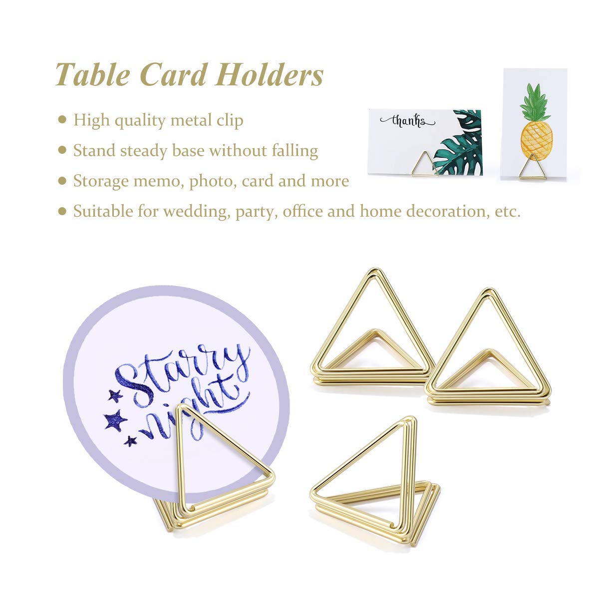 Lot de 12 porte-cartes de siège, porte-mémos, porte-photos, porte Ajustez le clip à l'angle et à la position souhaités en pliant la tige de fil flexible. Porte Cartes Originales PLACE DEBOUT VAISSEAU Spatial Support Pour Clip Mémo Porte-numéros Table EUR 5,89 - PicClick FR Porte-cartes Table Vous pouvez facilement le transporter dans votre poche ou votre sac à main et l'utiliser où que vous alliez. PATIKIL 13x9 Triangle Clé Douille, 4 Paquets Électrique Aroire Gaz Eau ètre Clé pour... Découvrez notre vaste gamme de 100 pièces Porte-cartes de table Clip à forme de triangle support de carte mini support de photo en métal pour décoration... Prenez en compte la taille de l'objet que vous souhaitez afficher dans le support de clip de mémo. Application : Le porte-cartes de table est idéal pour tenir les cartes de place, les photos, les mémos, les notes, les pancartes alimentaires et autres rappels importants. Si l'objet est trop grand ou lourd, il peut ne pas convenir au clip. Le clip peut maintenir fermement vos cartes, photos ou notes en place. Ces porte-cartes de table peuvent également être utilisés comme porte-numéros de table, porte-cartes de menu ou pour afficher des photos. Avantage : Nos porte-cartes de table ont un style élégant et raffiné qui ajoute une touche de sophistication à tout événement.