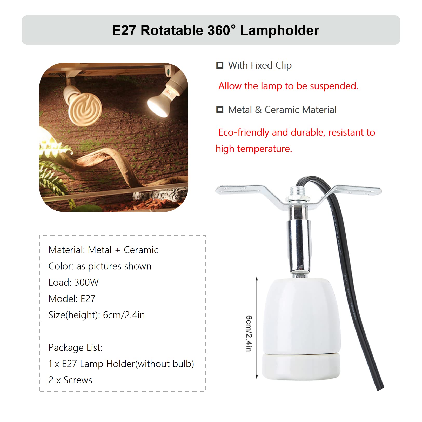 Caractéristiques du produit Nom de l'article : Lot de 2 douilles chauffantes E27 Matériau : Céramique Couleur : Blanc Dimensions : - 11 cm de long x 9 cm de large - Douille : 6 cm de long x 4,5 cm de large Contenu de l'emballage : - 2 douilles chauffantes - 4 vis Avertissement : En raison de la mesure manuelle, une erreur de 1 à 3 mm peut survenir. La construction en aluminium embouti intégrée et la surface résistante aux chocs garantissent une durée de vie de plus de 10 000 heures, même dans des environnements humides tels que les terrariums ou les fermes. 【Sûr et facile à utiliser】 Grâce à ses dispositifs de sécurité intégrés, la douille en porcelaine rotative à 360° est facile à utiliser : un joint d'étanchéité en caoutchouc intégré protège des projections d'eau (IP67), tandis que le contact de la base en cuivre prévient les courts-circuits. Le câble de 1,8 m et le système de suspension sans outil permettent une installation rapide dans les terrariums, les incubateurs ou les serres. PETLOFT Lot De 2 Lampes Chauffantes Infrarouges En Céramique 150 W Emetteurs De Chaleur En Ceramique Ac 90 120 V Non Lumineux Et Durable Pour Reptiles Et Amphibiens Poulailler Blanc La douille E27 en céramique combine un noyau en cuivre pur et une coque de protection en aluminium pour garantir une conduction thermique optimale et une résistance à la corrosion, idéale pour les lampes chauffantes haute performance. Utilisation universelle, de l'élevage de reptiles à l'industrie : Comme douille chauffante E27 en céramique, compatible avec les lampes chauffantes, les lampes UV et les éléments en céramique. SKY-Dilwe Douille de lampe chauffante E27 Reptile rotatif Pet Clip Heat... Grâce à sa conception compacte, la douille E27 en céramique peut être positionnée de manière flexible, même dans les aquariums exigus ou les espaces industriels. Les mécanismes de protection intégrés (indice de protection IP67, protection contre les courts-circuits) minimisent les risques en aquarium, en ferme ou en atelier. 【Support flexible : rotatif à 360°】 La conception unique de l'articulation pivotante de la douille de la lampe chauffante permet un alignement précis : la tête de la lampe peut pivoter à 360° horizontalement et s'incliner jusqu'à 180° verticalement. Douille Porcelaine Rotative 360° Terrarium Reptile 400W PNGOS Reptiles Douille De Lampe Chauffante En Céramique,E27 Douille En Porcelaine Pivotante à 360°, Dimmable,1,8M De Câble Et Fiche,pour Lampes Halogènes Jusqu'à 150 W(sans Ampoule Douille E27 Leroy Merlin Découvrez nos offres Douille de lampe céramique E27 : large sélection de produits au meilleur prix | Livraison gratuite à partir de 10€* | Entreprise française | Paiement 4x possible Le câble de 1,8 m avec prise européenne permet une installation sans outil : il suffit de le brancher et de le connecter.