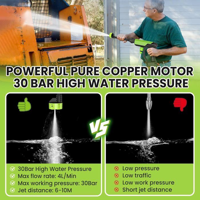 【Conception Réfléchie】 Le nettoyeur haute pression sans fil à batterie est livré avec un tuyau de 5 m équipé d'un filtre. Nettoyeur Haute Pression Sans Fil 21V Nettoyeur Haute Pression Sur... ⚠️【Conseils Chaleureux】Avant chaque utilisation, vérifiez que le nettoyeur haute pression et ses pièces ne sont pas endommagés. 【Nettoyeur Haute Pression avec 2 Batteries 】Ce nettoyeur haute pression sans fil est livré avec deux batteries rechargeables qui durent très longtemps, ne prenant que 3 à 4 heures pour se charger complètement, vous offrant 60 minutes de fonctionnement continu sur une charge complète. Nettoyeur Haute Pression Portable Ej.Life Nettoyeur Haute Pression Sur Batterie, Max 406 PSI Nettoyeur Haute Pression Sans Fil Portable Avec Accessoires Buse Multi Fonctions 6 En 1 Ideal Pour Voitures Maison Jardin 85057927 Karcher Sans Fil Alternative 【Ce Que Vous Obtenez】 Le kit de nettoyeur haute pression est livré avec 1 nettoyeur haute pression sans fil, 2 batteries, 1 chargeur rapide, 1 Buse 6 en 1, 1 tuyau de 5 mètres, 1 tête de sortie 0°, 1 tête de sortie 0° 45°, 1x adaptateur de bouteille, 1x récipient en mousse, 1x filtre à eau, 1x manuel d'utilisation. Comment résoudre le problème de non-absorption d'eau ? Ce filtre élimine efficacement les impuretés, les particules, les feuilles et les boues, offrant une meilleure protection à la machine et prolongeant sa durée de vie. Il ne s'agit pas d'un produit d'occasion. Il s'agit du résultat d'une inspection et de tests aléatoires en usine visant à garantir son bon fonctionnement. Paramètres de la machine de nettoyage haute pression Répond à la plupart de vos besoins quotidiens en matière de nettoyage de véhicule et d'arrosage du jardin. Il y a 1 jour · Faites pivoter la tête pour changer d’angle facilement. Utilisez le flacon mousse fourni pour un nettoyage intensif. Polyvalent, performant sur toutes les surfaces Si le nettoyeur haute pression n'absorbe pas l'eau pendant l'utilisation, versez un peu d'eau dans le raccord du tuyau pour libérer l'air à l'intérieur de la machine, générant ainsi une pression et permettant à la machine d'absorber l'eau sans problème. Ce produit ne dispose pas de fonction de coupure ; il est donc déconseillé de le raccorder directement au robinet. Nettoyeur haute pression sans fil - Nettoyeur Haute Pression sur