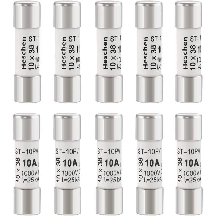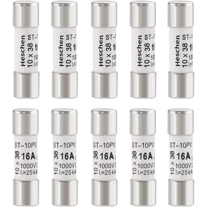 Fusible rouge 10A voiture sans permis Lot Fusibles 10x38mm Pour Panneaux Solaires Heschen Fusibles Solaires PV DC1000V, Fusibles Photovoltaïques Fusible 16a 230v Principaux points forts · Adaptateur de courant CA. 6 A · Marque. Heschen · Voltage. 1000 Volts · Matériau. Silicone polycristallin · Spécifications respectées. IEC Les produits sont connectés en série et en parallèle avec des panneaux photovoltaïques et des batteries pour fournir une protection contre les courts-circuits pour le système de charge et de convertisseur ; en même temps, pour les centrales photovoltaïques, l'onduleur de confluence protection contre les coupures de court-circuit ; et pour le système de production d'énergie photovoltaïque contre les surtensions et les courts-circuits, capacité de coupure nominale jusqu'à 33 kA. Fusible Photovoltaïque DC1000V (15A) - Lot de 10 Fusibles Solaires Type... Norme : IEC(EN) 60269-6 Capacité de rupture : 33 kA , Dimensions : 10 x 38 mm