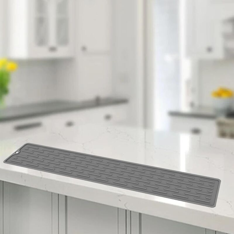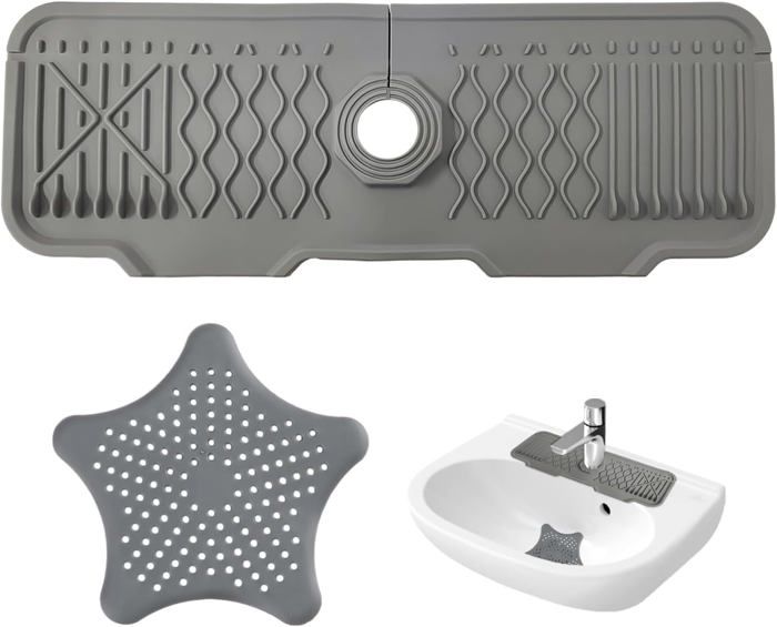 Auirshiky Tapis de Robinet en Silicone Gris,Tampons de Robinet en Protection Robinet Exterieur Antigel 2 Pièces Tapis Evier Cuisine PVC Tapis D'évier Découpable 40 X 30cm Tapis De Protection Evier Protege Evier Antiderapant Tapis Fond Evier 97980116 Tapis évier Silicone Gris ANTI-SLIP DESIGN] - Cet tapis égouttoir est fait d'un revêtement en silicone épais de 5MM, a d'excellentes performances antidérapantes, empêche les taches de pénétrer, utilise pleinement la résilience douce du silicone, protège fortement le comptoir et le bureau Drainage rapide et efficace : la protection anti-éclaboussures de l'évier est conçue pour s'adapter autour de la base du robinet, elle empêche l'eau d'éclabousser sur vos comptoirs et votre vaisselle, gardant la zone propre et sèche. Avant l'achat, veuillez noter les dimensions : le tapis d'égouttage de cuisine de 45x14 cm convient aux robinets d'un diamètre de 3.5 à 6 cm. C'est un choix idéal pour la plupart des éviers standard. Veuillez mesurer les dimensions de votre évier et de votre robinet, ainsi que la distance entre le robinet et le mur, pour garantir un ajustement parfait.[Environnement] Le plateau goutte à... Tapis de robinet d'évier de cuisine : les petits pores de la pierre de terre de diatomées sont incroyablement absorbants, absorbent rapidement les éclaboussures et sèchent en quelques minutes, dites adieu aux gouttes gênantes et gardez tout au sec ! Protecteur de robinet et tapis de vidange : simplifiez votre routine de nettoyage de cuisine et gardez votre évier sec et organisé avec le tapis de vidange pour robinet anti-éclaboussures.