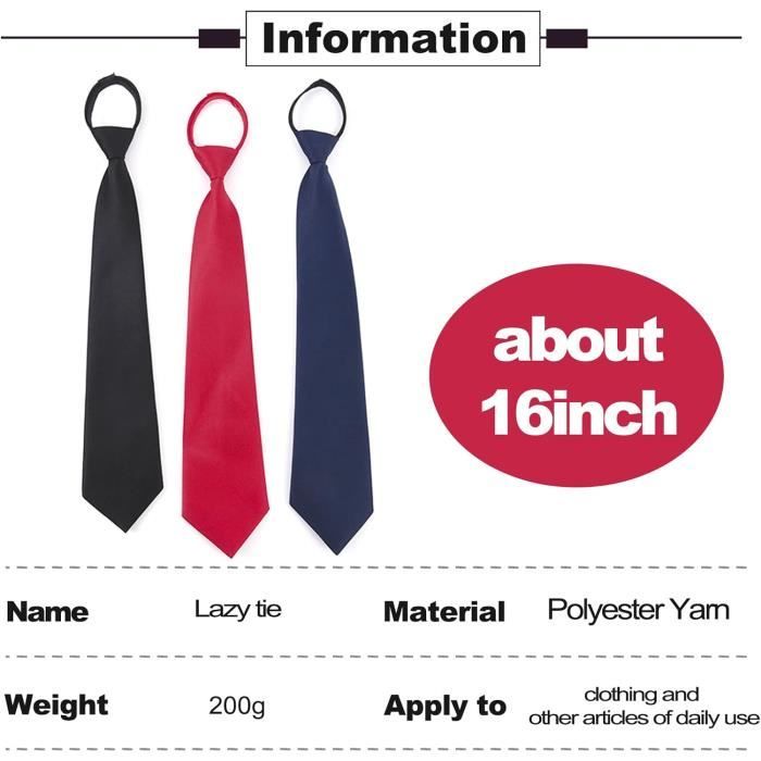 PYSEOSISE Ensemble de 3 cravates à clipser réglables et 3 Cravate Réglable Sans Noeud PYSEOSISE Ensemble De 3 Cravates à Clipser Réglables Et 3 Pinces à Pack 3 Cravates Classiques Noir Bleu Rouge Cravate Pour Enfant À Rayures-Cravate Pré-Nouée Avec Élastique[x5942... Contenu du paquet : vous recevrez 3 pièces pince à cravate et 3 pièces cravate à fermeture éclair dans 3 couleurs classiques: noir, bleu et rouge, design simple et facile à utiliser, adapté à différentes occasions Ce pack de 3 cravates pré-nouées avec fermeture éclair est la solution idéale. En polyester satiné, elles sont super faciles à ajuster et à enfiler - même si t... Design pré-confectionné : chaque cravate homme est déjà nouée, il vous suffit de l'attacher à votre chemise, ce qui vous fait gagner du temps et vous permet de vous présenter avec style lors de vos rendez-vous Matériaux de haute qualité : Ces cravates pré-nouées sont faites de polyester, et équipées d'une fermeture à glissière en plastique, il a un toucher lisse et une texture douce, infroissable et indéformable