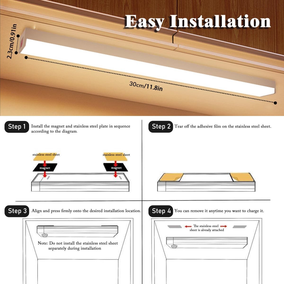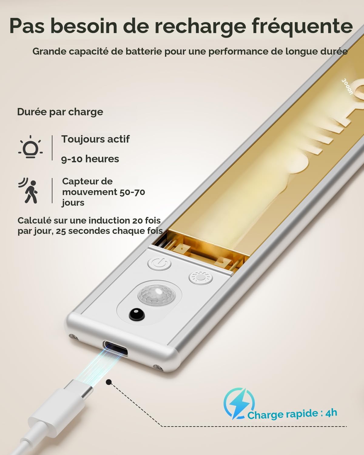 Installation simple : livré avec deux bases magnétiques solides pour une fixation facile sur différentes surfaces ; il suffit de décoller le film protecteur et de placer la lumière là où nécessaire, un positionnement sécurisé tout en permettant le repositionnement. Lampe LED Rechargeable 3 Températures Couleur Lampes LED RGB Rechargeables Avec Télécommande, 3 Packs Puck Lumieres Lampe De Cuisine Sous Placard Avec Fonction De Synchronisation Eclairage Sans Fil A Coller Pour Armoire Vitrine 92358498 Lampe Magnétique Sans Fil Télécommande Caractéristiques : * Éclairage agréable pour les yeux : la lampe sous armoire dispose d'un couvercle anti-reflet exceptionnel et d'économie d'énergie qui offrent un environnement plus doux, créant un environnement confortable pour votre routine de beauté et vos tâches quotidiennes. Télécommande et 2 modes de fonctionnement] Vous pouvez utiliser la télécommande pour allumer/éteindre les lumières sous l'armoire, sélectionner la température de couleur, régler la luminosité et régler la minuterie * Dimensions : 30 x 7 x 5 cm., Couleur : blanc. Contenu de l'emballage : 1 plafonnier de cuisine. Lampe De Bureau Sans Fil Éclairage Sous Armoire Rechargeable Veilleuse... *Fonctionnalité polyvalente : parfaite pour l'application de maquillage, l'organisation de placard et l'éclairage de bureau, cette lampe polyvalente sous armoire s'adapte à vos besoins. * Gestion intelligente de la batterie : équipée d'un indicateur précis de niveau de batterie, cette lampe rechargeable vous permet de surveiller les niveaux de puissance sans effort. Éclairage respectueux des yeux : cette lampe sous armoire dispose d'une couverture anti-reflet exceptionnelle qui crée un environnement plus doux et plus confortable pour votre routine de beauté et vos tâches quotidiennes. Lot de 3 lampes LED sans fil réglables pour dessous d'armoire, éclairage d'intérieur réglable avec aimant rechargeable par USB et aimant, lumières sous comptoir pour armoires de cuisine (blanc chaud La batterie prend en charge la charge rapide, offrant jusqu'à 4 heures d'éclairage continu à une luminosité maximale. [Gestion intelligente de la batterie] Équipée d'un indicateur de niveau de batterie précis, cette lumière rechargeable vous permet de surveiller sans effort les niveaux de puissance, prenant en charge une charge rapide jusqu'à 4 heures d'éclairage continu à une luminosité maximale.