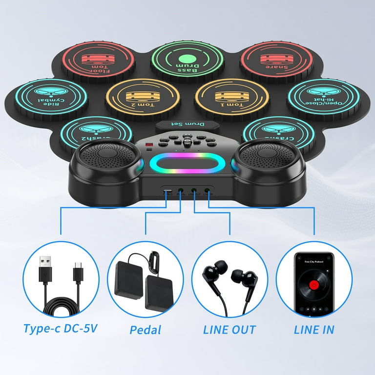Aeroband Pocketdrum Batterie électronique Portable à 9 Pads, Son Externe, BT, Pratique - Instruments De Instrument Percussion Portable Pliable Ensemble De Batterie Électronique Pour Enfants Avec 9 Pads Haut Parleurs Bluetooth Et Pedales Tekmaquinas 98773190 Jouet électrique portable avec 9 pads. Ce kit de batterie électronique comprend 1 caisse claire, 1 tambour Treble, 1 grosse caisse basse, 1 tom au sol... 【DÉBUTANTS EN BATTERIE ÉLECTRONIQUE】Notre modèle Kit De Batterie Électronique Portable à 9 Pads convient parfaitement aux débutants, enfants ou adultes. 【PLUS DE FONCTIONNALITÉS POUR UNE BATTERIE ÉLECTRONIQUE PLIABLE】Le modèle Kit De Batterie Électronique Portable à 9 Pads prend en charge la connexion à un ordinateur ou un téléphone portable via USB ou MIDI, vous permettant de jouer à vos jeux préférés ou d'écouter votre musique préférée. Vous pouvez également choisir librement votre musique et créer vos propres morceaux. Modèle à deux haut-parleurs Kit De Batterie Électronique Portable à 9 PadsHaut-parleurs stéréo haute fidélité, son surround immersif, pour une expérience immersive, un son plus puissant, plus magnétique et une meilleure qualité sonore. 【CASQUE ET CONNEXION AUXILIAIRE】Profitez d'une expérience musicale privée grâce à la sortie casque 3,5 mm, sans déranger les autres pendant que vous vous entraînez. Jouons n'importe où, n'importe quand, pour réduire le stress et améliorer notre qualité de vie. C'est un excellent cadeau pour Noël, les anniversaires et les occasions spéciales. Rechargeable&Portable : La batterie rechargeable intégrée offre jusqu'à 10 heures de jeu par charge. Fabriqué en silicone durable, ce kit de batterie électronique peut être facilement enroulé pour être transporté partout