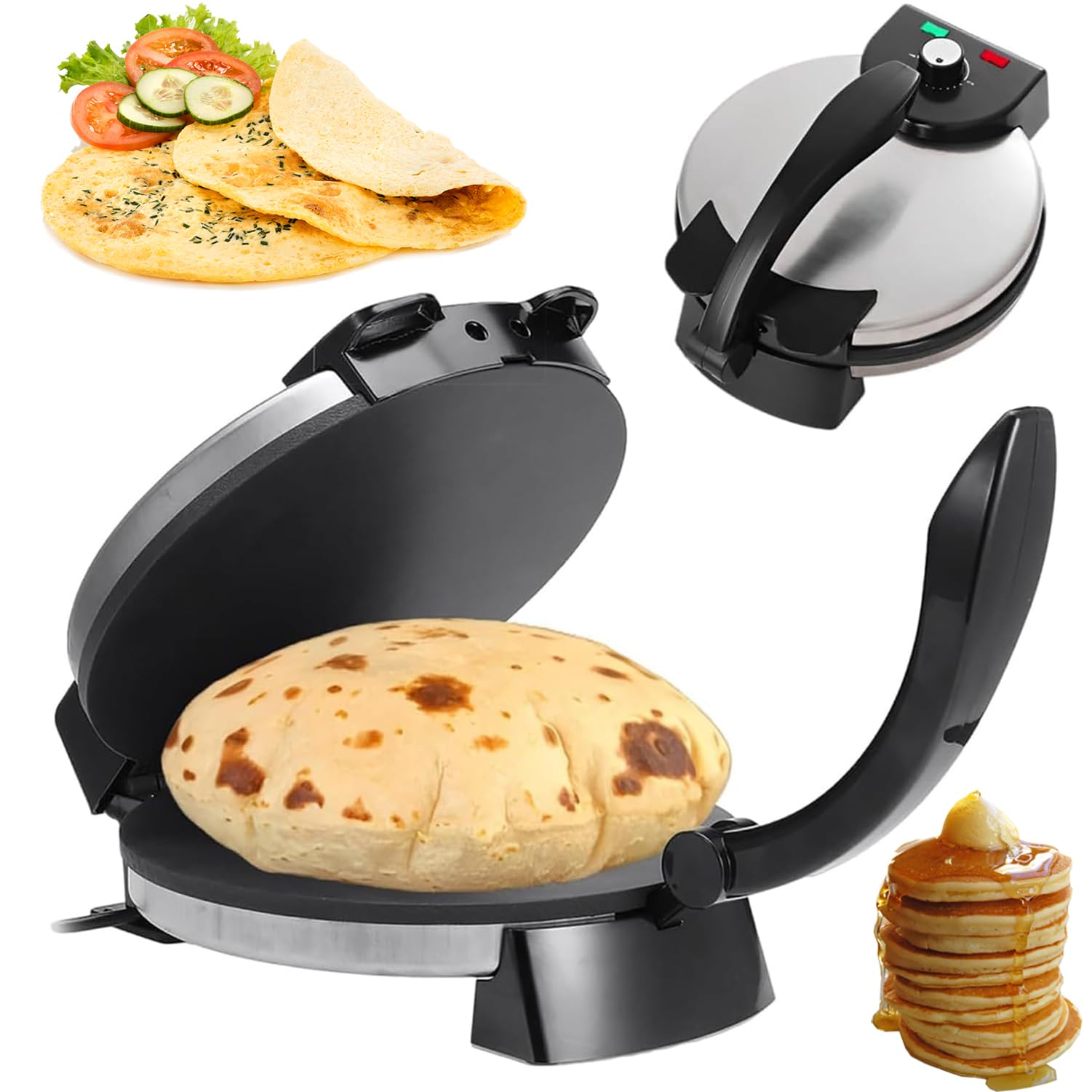 Dimensions ouvert : 26 x 26 x 34 cm. Machine à Maki Roti Maker Presse électrique à Tortilla, Pour Chapati, Boulangerie, Pain Plat Naan, 200 °C, Pour Crêpes, Omelettes, Jambon De Palais - Diamètre : 25,5 Cm Roti Maker 1200w Il produit de délicieuses crêpes de couleur et de forme uniformes en quelques minutes seulement. Revêtement non adhésif : la plaque de cuisson avec revêtement non adhésif empêche les aliments brûlés, réduit la quantité d'huile utilisée et rend les aliments plus savoureux et plus sains. Très efficace : avec une puissance de 1200 W, une plaque de cuisson plate et une méthode de chauffage double face, la machine Roti assure un chauffage uniforme et rapide. Haute sécurité : les ventilateurs de dissipation de chaleur au fond garantissent une bonne dissipation de la chaleur pendant le fonctionnement et la machine arrête automatiquement le chauffage une fois terminée. Machine à Roti électrique 1800 W, Machine à Tortilla Chapati Chauffage : chauffage double face. Contenu de l'emballage : 1 x Roti Maker Remarquez: 1., N'utilisez pas d'accessoires métalliques pour plier, nous vous recommandons d'utiliser une spatule en bois ou en silicone (non incluse). Dimensions du produit (couvercle fermé) : 26 x 34 x 19,5 cm. Régulateur de température : vous pouvez ajuster la température (jusqu'à 260 °C) en fonction de vos besoins de cuisson via le régulateur pour préparer différents plats délicieux. Vous pouvez donc l'utiliser en toute confiance. BEL-presse à pain plat Presse à Tortillas en Alliage D'aluminium... Presse À Tortilla Électrique Commerciale De Cm,Appareil De Pressage... Spécificités : Modèle : BM-926., Matériau : acier inoxydable, bakélite Procédé : revêtement antiadhésif Couleur : noir, argenté., Forme : ronde. Longueur du câble d'alimentation : 75 cm. Matériaux de qualité supérieure et sûrs : la machine Roti Maker est fabriquée en acier inoxydable de haute qualité qui résiste à l'usure, à la rouille et aux chocs. Utilisation : 1., Préparez la pâte., 2., Branchez l'alimentation et le voyant rouge et la lumière verte finie s'allument., 3., Ajustez la température (le voyant vert s'éteint lorsqu'il est prêt)., 4., Divisez la pâte en petits morceaux et appuyez doucement avec vos mains avant de la mettre dans la machine., 5., Placez la pâte au centre du moule., 6., Fermez le couvercle., 7., Le Roti devient moelleux après environ 15-20 secondes.