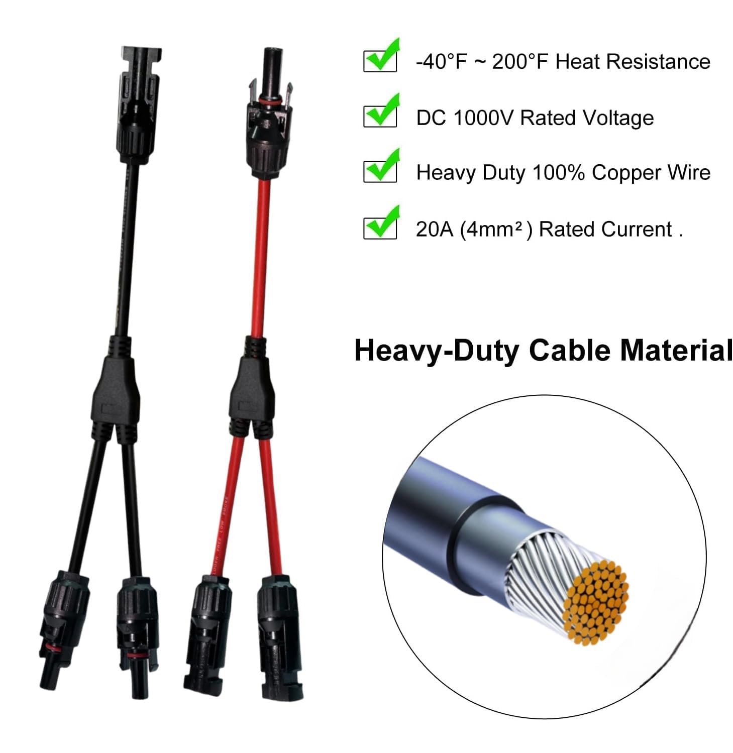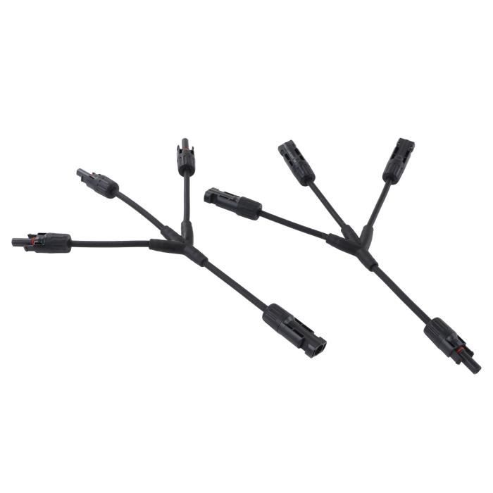 1 paire de connecteurs de câble pour panneau solaire en Y - Adaptateur Grande facilité d'utilisation pour montage rapide : Ce cable solaire 6mm2 dispose d'une conception à boucle autobloquante, offrant une connexion plug-and-play avec des fiches/prises clairement différenciées. Connecteur Y Panneau Solaire RUNCCI-YUN 5 Paire Solaire Panneau Câble Connecteur (1 à 2 Branches) Y Connecteu Câble 10AWG 1000V Tension nominale DC1000V, tension d'essai DC6000V, courant nominal ≤30A ; température de fonctionnement -40℃ à +85℃, indice de protection IP67., En tant que cable panneau solaire, il garantit une performance stable pour toute votre installation photovoltaïque. Connecteur parallèle MC4 Y Branch 1 mâle à 2 femelles (M/FF) et 1 femelle à 2 mâles (F/MM), double anneau d'étanchéité pour un meilleur effet étanche. Compatible avec les câbles PV avec différents diamètres d'isolation Type Y branche connecteur, solaire panneau câble connecteur, adapté au système photovoltaïque solaire. (1 mâle à 2 femme et 1 femme à 2 mâle).Le connecteur s'applique spécialement aux systèmes solaires photovoltaïques, avec des exigences mécaniques et des conditions météorologiques extrêmes.Matériel PPO, Ignifuge, waterproof et... Résistance exceptionnelle aux intempéries : Ce cable mc4 fonctionne en sécurité entre -40℃ et 85℃, résistant aux conditions extrêmes. Les mc4 connecteur solaire associés utilisent des conducteurs en cuivre de 6 mm², sans perte d'énergie en série – vous gagnez temps et efforts, même sans expérience en montage. Associés à d'autres cable panneau solaire, ils offrent un confort de montage rapide, indispensable pour la production d'énergie solaire privée et commerciale. Épaisseur d'isolation : 0,92 mm ; résistance de contact ≤0,5 MΩ. Sa conception 1Y2 combine deux câbles en un, réduisant l'enchevêtrement et simplifiant le câblage. Spécifications précises pour des installations solaires fiables : Ce cable mc4 de 30 cm combine un matériau extérieur PA, un connecteur en PPO et un conducteur en cuivre de câble solaire 6mm2 (6 mm²/10 AWG).