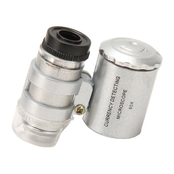 Microscope Compact Voyage MicroMini Microscope De Poche éclairé Par LED 20x Avec Lampe De Poche Microscope De Poche Pour Enfants Microscope LED Portable Bijoux Microscope De Poche Numérique 60x VINGVO Microscope de poche éclairé par LED 60x-100x Microscope de Poche... Fabriqué avec des lentilles en ABS et en acrylique, ce microscope portable est résistant aux rayures et conçu pour durer. Que vous soyez à la maison ou en déplacement, ce microscope compact est facile à transporter et à utiliser dans une variété de paramètres. Avec son grossissement puissant et son éclairage polyvalent, ce microscope de poche deviendra un outil indispensable dans votre collection. Petit microscope de poche 60x portable éclairé par LED avec sac de rangement pour observations de bijoux Caractéristiques : Ce microscope de poche dispose d'un grossissement 60x et de trois éclairages, ce qui en fait l'outil pour l'observation des bijoux et la détection de devises. Contenu du paquet : 1 microscope de poche. Remarque : Les mesures étant prises à la main, les tailles indiquées peuvent varier de 1 à 3 cm. La couleur de l'article peut varier de celle de la photo, en fonction des paramètres d'affichage et de luminosité de votre ordinateur. 2 en 1 Portable Stylo Testeur Diamant avec 60X LED Éclairé Loupe...