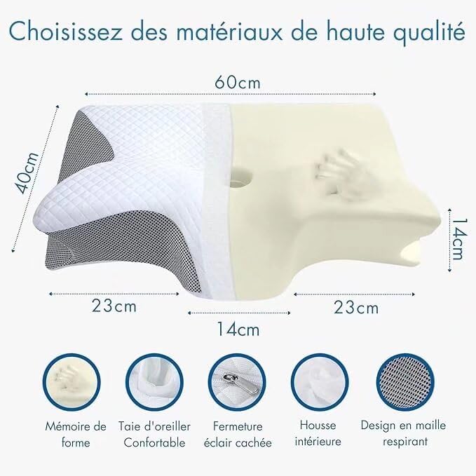 Ne convient pas au sèche-linge. Mousse Mémoire Forme Confort Nuque SOYA Paris Oreiller 2.0, SOYA Paris Oreiller, SOYA-Align Avis Trustpilot Sa structure ventilée prévient la surchauffe, tandis que sa housse lavable préserve la fraîcheur et la propreté de votre surface de sommeil. Il aide à maintenir une posture correcte et réduit les tensions causées par un mauvais alignement, sans aplatissement ni déplacement pendant la nuit. Les découpes intégrées au niveau des épaules et les zones surélevées réduisent la pression et favorisent une posture correcte tout au long de la nuit, pour un sommeil plus profond et plus réparateur. Il offre un soutien constant nuit après nuit pour un confort longue durée et est idéal pour les personnes recherchant une aide au sommeil améliorant leur posture. Soya Paris - Élu Meilleur Oreiller Orthopédique De 2024 Obtenez Le 2ème à 30 Pour Un Sommeil Idéal pour les personnes dormant sur le côté ou sur le dos à la recherche d'un sommeil confortable et ergonomique. Éviter d'utiliser de l'eau de Javel ou des produits chimiques agressifs sur la housse. La mousse intérieure n'est pas lavable ; nettoyer les taches avec un détergent doux si nécessaire. 【Adapté à tous les types de sommeil】 : Que vous soyez sur le côté ou sur le dos, SOYA Paris Oreiller 2., 0 s'adapte à votre position grâce à un soutien intégré pour la tête et la nuque. Son ajustement universel et sa conception ergonomique en font un choix polyvalent pour tous les environnements de sommeil et toutes les configurations de matelas. Pourquoi adopter l'oreiller SOYA 2.0 ? ✔️ Alignement cervical parfait ✔️ Réveil sans douleurs ✔️ Sommeil profond et réparateur ✔️ Mousse... Plongez dans un sommeil réparateur avec l’Oreiller Soya 2.0 en mousse à mémoire de forme. Ergonomique, orthopédique et hypoallergénique, il assure un confort optimal et un alignement parfait pour toutes les positions de sommeil Il favorise une posture saine. Les contours intégrés guident naturellement votre tête et votre cou., Alignement. 【Soutien ergonomique de la nuque】 : SOYA Paris Oreiller 2., 0 est doté d'une mousse à mémoire de forme multi-contours qui épouse la courbe naturelle de votre nuque et aligne votre colonne vertébrale pendant votre sommeil. Caractéristiques du produit SOYA Paris Oreiller 2., 0 est conçu pour un sommeil réparateur grâce à des zones de soutien aux contours précis et une structure respirante.