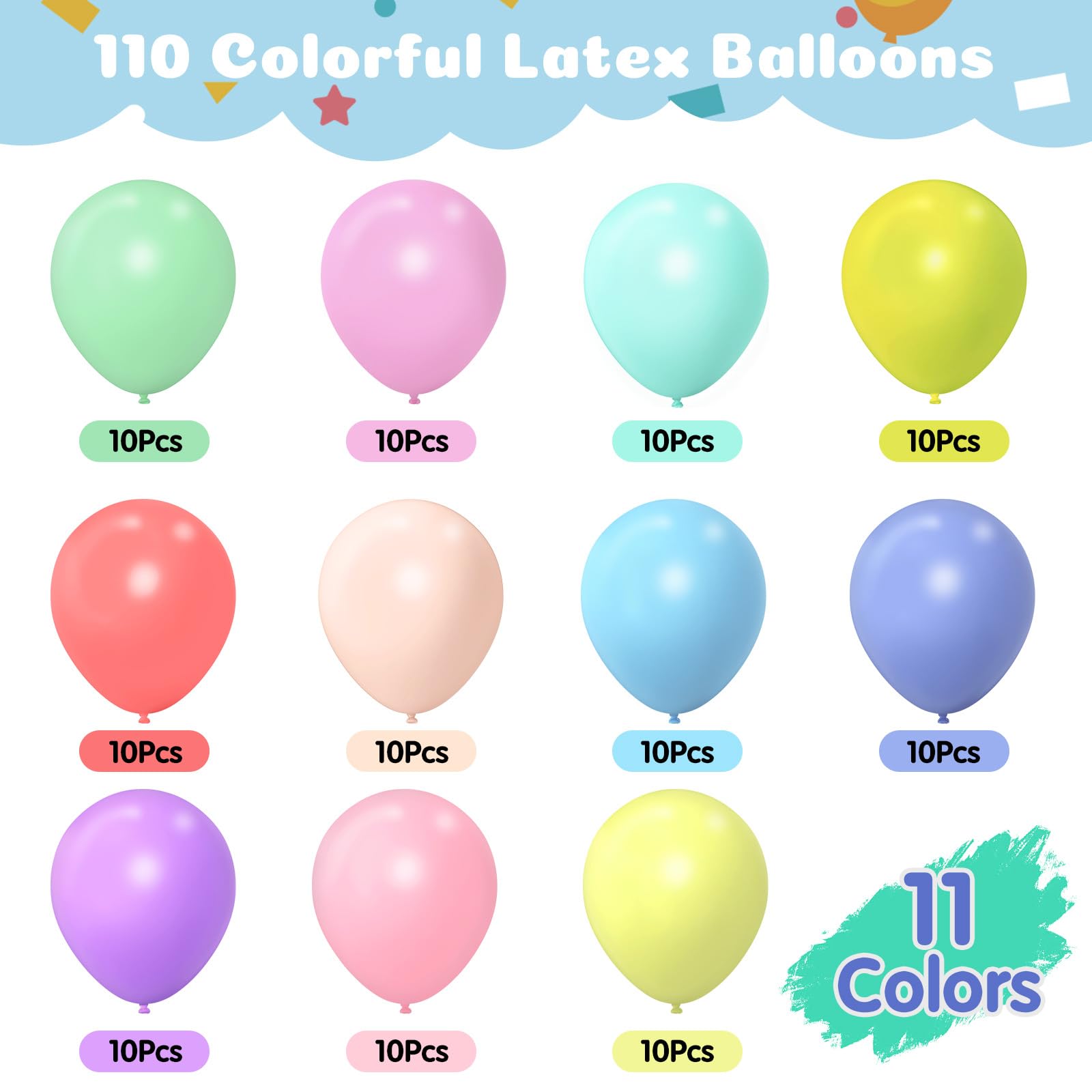 Spécifications • Quantité : 110 ballons pastel • Taille : 5 pouces (avant gonflage), jusqu'à 12 pouces (quand gonflé) • Couleurs : 11 couleurs vibrantes (10 ballons par couleur) • Matériau : Latex de haute qualité Conseils Pratiques • Gonflez à ne pas plus de 80 % de la capacité pour éviter le sur-gonflage et maintenir la durabilité. Chez , nous avons une grande collection de ballons de baudruche colorés : ballons multicolores, ballons unis, ballons métallisés, ballons mat, ballons pastel... Que vous organisez un anniversaire enfant, une baby shower, un baptême ou une fête entre amis, faites le plein de ballons de baudruche pour une décoration haute en couleur 【Couleur & Quantité】Ce set comprend 110 ballons pastel de 12 pouces, dans 11 couleurs douces comme crème, bleu clair, violet pâle, rose, vert, jaune, etc. • Compatibles avec l’hélium, ces ballons helium flottent magnifiquement et sont parfaits pour les arches, les affichages flottants ou les grands ballons. Fête Mariage Baby Shower Arc Ballons 5 Ballons Joyeux Anniversaire Pastel 33cm Pour L'anniversaire De Votre Enfant Ballons Multicolores Baby Shower Avertissement De Sûreté Non Applicable Description du produit Illuminez Votre Célébration avec des Ballons Pastel ! • Évitez les objets pointus ou les sources de chaleur pour prévenir l’éclatement. Avec 10 ballons de chaque couleur, ces ballons anniversaire sont parfaits pour les fêtes des enfants, anniversaires ou célébrations. 【Matériau Durable & Flexible】Fabriqués en latex de qualité, ces ballons gonflables multicolores sont solides et élastiques. • Fabriqués en latex de haute qualité, ces ballons multicolores sont durables, élastiques, et parfaits pour une utilisation intérieure ou extérieure. • Gonflez-les à différentes tailles pour des formes variées et des décorations créatives. Generic Ballon Decoratif-Ballon De Decoration-Ballon De Baudruche... • Ce set comprend 110 ballons pastel anniversaire pour fille dans 11 couleurs, parfaits pour des décorations de fête pastel et ajoutant une touche douce de couleur à tout événement. Idéals pour créer des ballons arc en ciel ou des décorations flottantes avec des ballons helium pour vos fêtes. Ballons de baudruche pas chers (2025