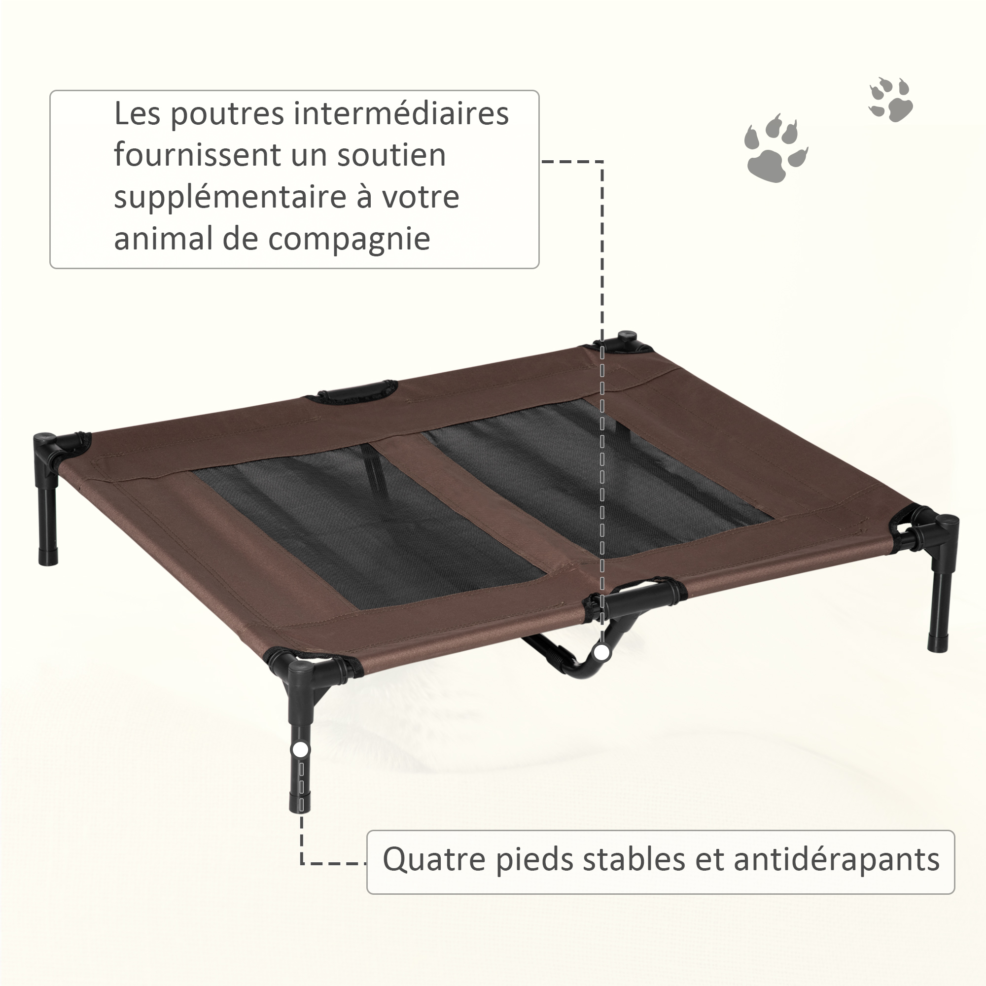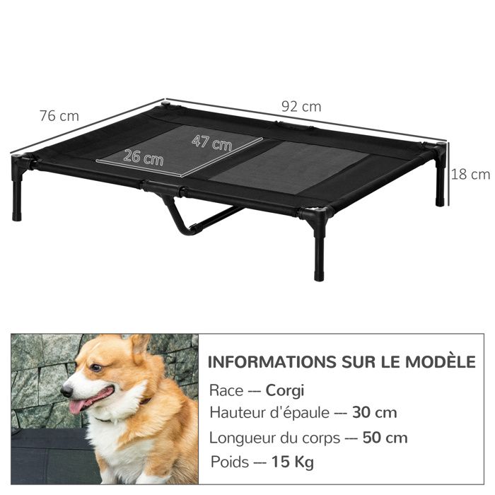Aujourd’hui Pawhut étend sa gamme de produits et propose également des équipements pour oiseaux, lapins, poules… Apportez leurs du divertissement Offrez-leur l'occasion de s'amuser pour ne pas qu'ils s'ennuient. Dimensions généreuses, grand espace pour le confort de votre chien ou chat Grâce à sa dimension généreuse et à sa fabrication sur pied, votre animal se sentira très à l'aise et en forme pour votre plus grand bonheur ! ENTRETIEN PRATIQUE : facile à nettoyer pour un usage pérenne , SPÉCIFICATIONS : dim. Pour vous offrir plus de praticité mais aussi pour répondre aux différents besoins des animaux. Lit Sur Pieds Chien PawHut Lit Sur Pieds Lit Pour Chien Chat Lit De Camp Lit Surélevé Animaux Grand Confort Tissu Oxford Textilène Micro-perforé Métal 92L X 76l X 18H Cm Panier Chien PawHut Lit surélevé pour Chiens Chats Animaux de Compagnie Tissu Refuge pour animaux de compagnie Véritable maison cosy et confortable pour vos amis à quatres pattes, offrez leur tout le confort dont ils ont besoin. Il fournira assez d'espace à votre animal pour jouer et se reposer. MATÉRIAU NOVATEUR : Matière centrale de dernière génération en textilène micro-perforé pour une excellente ventilation et le bien-être de votre animal même par forte chaleur Ce superbe lit sur pied bicolore gris clair noir avec velum en forme de dôme apportera une touche d'originalité, de modernité et d'élégance à votre espace intérieur ou extérieur. Ce lit apportera un confort inégalé à votre chien même pendant les fortes chaleurs de l'été ! - Réf. : D04-057 Sûr Nous utilisons des matériaux de qualité pour rendre la structure du produit stable et durable, non toxique, convient parfaitement pour vos animaux de compagnie. UTILISATION ET ENTRETIEN FACILE : Facile à monter et à démonter pour le transport <br/> Les poils, la saleté ou la crasse ne collent pas au maillage serré, vous pouvez utiliser un savon doux pour le lavage à la laisser sécher à l'air. totales : 92L x 76l x 18H cm - Charge max., reco., : 30 Kg Lit sur pieds XXL pour chien chat lit de camp animal lit surélevé tissu... CONCEPTION ROBUSTE : Le cadre en métal assure la stabilité et la sécurité du lit de l'animal pour permettre à votre chien de bien se reposer - Une surface de couchage soutient confortablement vos animaux et résiste aux déchirures des griffes des égratignures et empêche le lit de glisser lorsque votre chien saute dessus SPÉCIFICATIONS : Dimensions totales : 92L x 76l x 18H cm <br/> - Dimensions de la surface microperforée : 47L x 26l cm <br/> - On vous conseille que le poids de votre animal domestique de dépasse pas de 30 Kg, veuillez bien tenir compte de la taille d'animal Design moderne et élégant