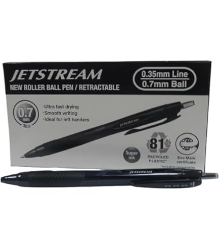 Uni Jetstream Lite Touch Ink Uni-ball Jetstream Ballpoint Pens, Fine Point (0.7mm), Blue, 12 Count Uni-Ball SXN-157E 0.7mm Meilleures stylo jetstream 0.7 - Janvier 2026 Uni-ball Rollerball JetStream SXN-157E Noir 0,7 mm Boîte de 12 unités ... 0,7 mm Encre bleue. 4,5 étoile(s) sur 5 50. 2 ... Uni Jetstream Standard Ballpoint Pen 0,7... Malgré son renouvellement écologique, le nouveau Jetstream conserve les performances et la fiabilité inégalées que vous attendez de notre marque. De sa douce expérience d'écriture à son encre à séchage rapide. Comme cette nouvelle version est fabriquée avec 81 % de plastique recyclé et est rechargeable, elle est certifiée Eco Mark. Désormais fabriqué avec des matériaux plastiques recyclés, il symbolise notre engagement à réduire l'impact environnemental sans sacrifier l'excellence. Cette certification est accordée par l'Association japonaise de l'environnement. Pointe en acier inoxydable , Boule de 1 mm. En carbure de tungstène , Séchage instantané Faits saillants · Pointe en acier inoxydable · Boule en carbure de tungstène de 0,7 mm · Séchage instantané · Corps en plastique