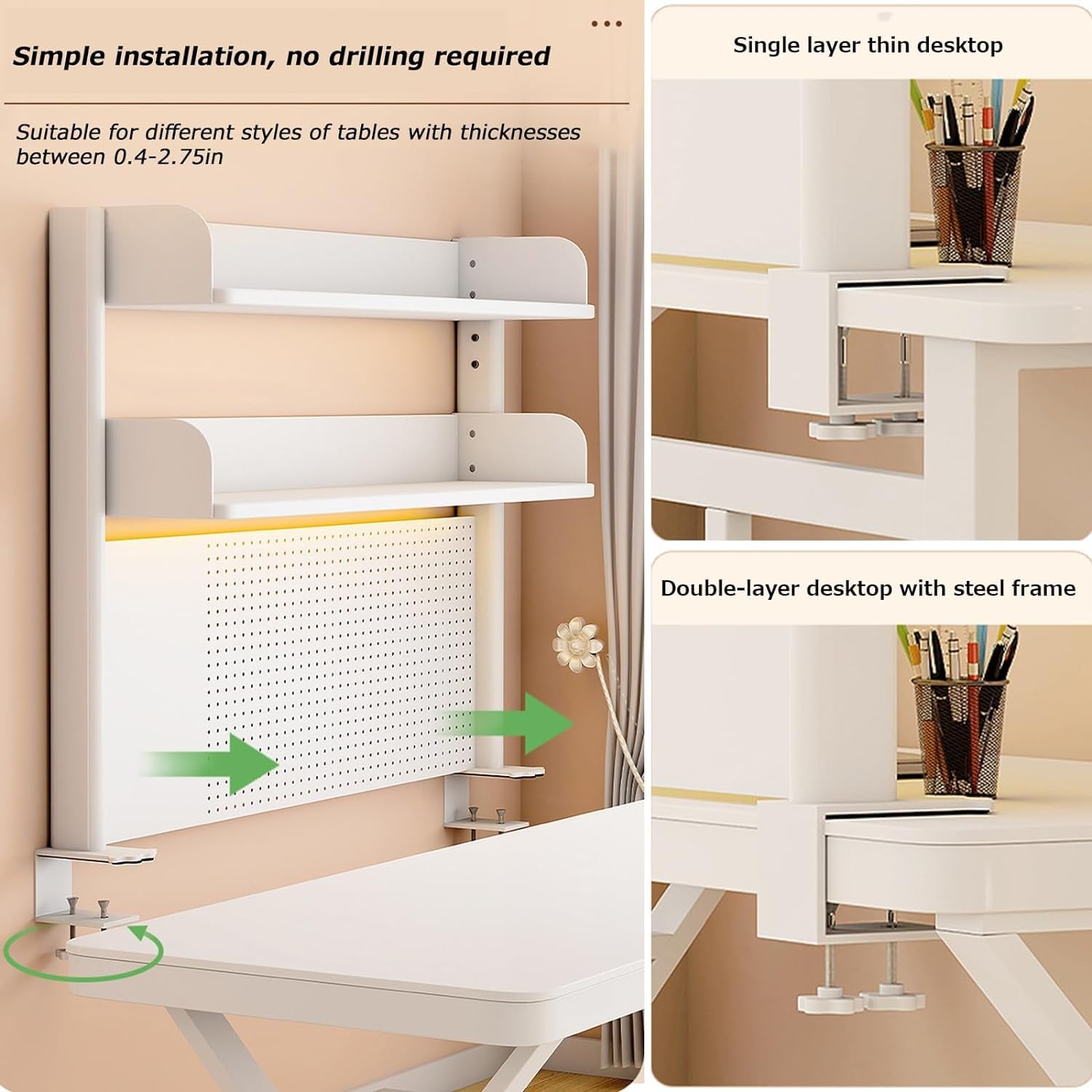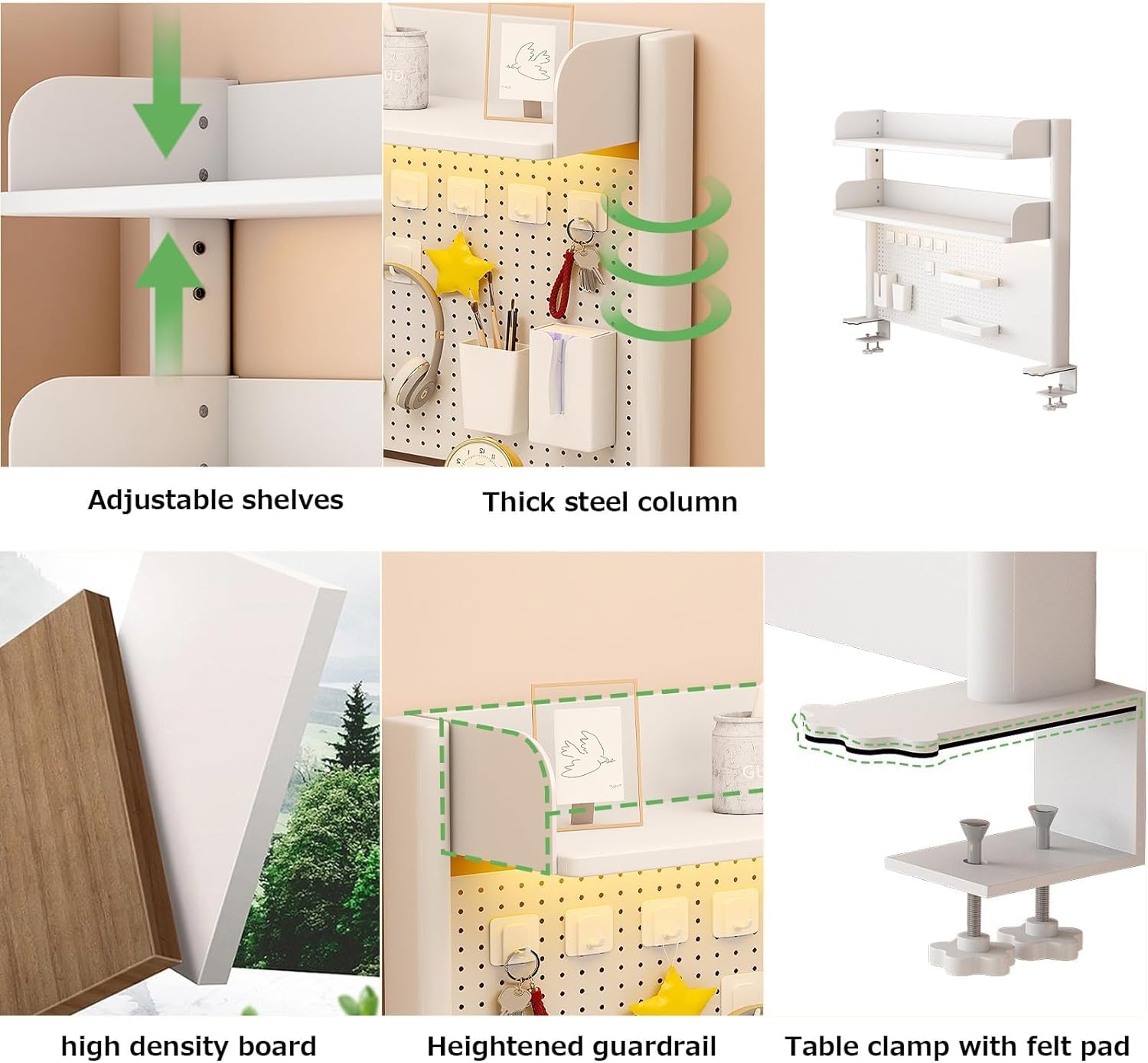 【Se déplace avec votre bureau】 Bénéficiez du même accès à cette plate-forme de stockage, que vous soyez assis ou debout. Support Bureau 15kg Industriel Etagere Rangement Bureau Panneau Perforé De Bureau à Pince, Panneau De Confidentialité Pour Bureau, Panneau Perforé En Métal Magnétique Avec Accessoires, Organisateur De Bureau De Jeu(Green,40*80cm/16 Chaise Bureau Description du produit Étagère De Bureau À Pince, Extension De Desk en Panneau Perforé, Accessoires De Burea D'ordinateur pour Bureaus, Panneau De Confidentialité pour Burea De Jeu Avertissement De Sûreté Ne pas dépasser la capacité de charge de 15 kg par étagère. XIJ Pince à sertir Jeu de pinces à sertir réseau perforé lame 7092762243200 - Bricolage Taille: 60*20*95 cm, 80*20*95 cm, 100*20*95 cm. 【Système à double étagère】 : deux étagères réglables empilées verticalement offrent flexibilité et esthétique de stockage. W pince 2pcs - Accessoires de panneau perforé en plastique de style nordique, mallette de... 【Matériau】 La colonne est constituée d'une colonne en acier de 6*3 cm, avec une surface de peinture à haute température, avec 2 couches de stratifiés haute densité réglables ; pas facile à rouiller, durable et solide. Veuillez installer correctement l'étagère en suivant les instructions fournies pour éviter tout dommage au mobilier ou blessure personnelle. Il y a 31 cm d'espace entre les étagères et l'espace de rangement inférieur mesure 53 cm de haut, ce qui peut accueillir un écran d'ordinateur de 28 pouces. YOSOO pince en verre Étagère en verre à pince épaissie en alliage de zinc, raccords de Chaque étagère supporte jusqu'à 15 kg de poids. 【Installation simple par pince 】 la double pince en C se fixe aux dessus de table jusqu'à 2 cm-7 cm d'épaisseur avec deux vis qui se serrent simplement à la main, aucun outil ni perçage dans le dessus de table n'est requis, ce qui rend l'installation un jeu d'enfant.