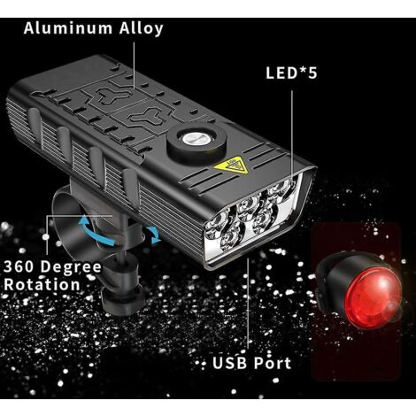 Phare extérieur étanche à LED, phare rechargeable par USB 3 phares Même en cas de fortes pluies ou de neige, Phares Vélo Puissants 2Pcs Vélo Feu Arrière Phare Avant Et Arrière Led Vélo Lumière Usb Lampe Vélo Rechargeable 5 LED C'est le choix parfait pour la combinaison des zones urbaines et montagneuses, avec puissants feux avant blancs et feux arrière rouges avec réflecteurs. Phare rechargeable de lumière de vélo de 5000 lumens, lampe de vélo LED... JOFLY Feu Arrière Vélo 110 luens Puissant, Éclairage Vélo Rechargeable... Il peut également être utilisé pour les lampes de poche d'urgence ou les endroits à faible visibilité. [Feux de vélo puissants avant et arrière] kit d'éclairage de vélo est livré avec des phares de 7000 lumens et des feux arrière gratuits, d'une valeur de 20,99 $ US, jusqu'à 100 pieds, 5 lumières LED, 18650 grosses batteries au lithium, qui peuvent fonctionner pendant 17 heures et illuminer votre chemin vous permet de rester visible de nuit comme de jour. Nous sommes convaincus que vous tomberez amoureux de nos lampes de vélo et fournirons une paire de supports en caoutchouc qui peuvent ajuster n'importe quelle taille de guidon. Pas besoin de gaspiller de l'argent sur les piles. il convient au cyclisme, à la randonnée, au camping ou à toute activité de plein air. [Chargement USB] La batterie rechargeable vous permet de charger facilement à partir d'un ordinateur, d'un ordinateur portable, d'une alimentation mobile ou de tout appareil doté d'un port USB.