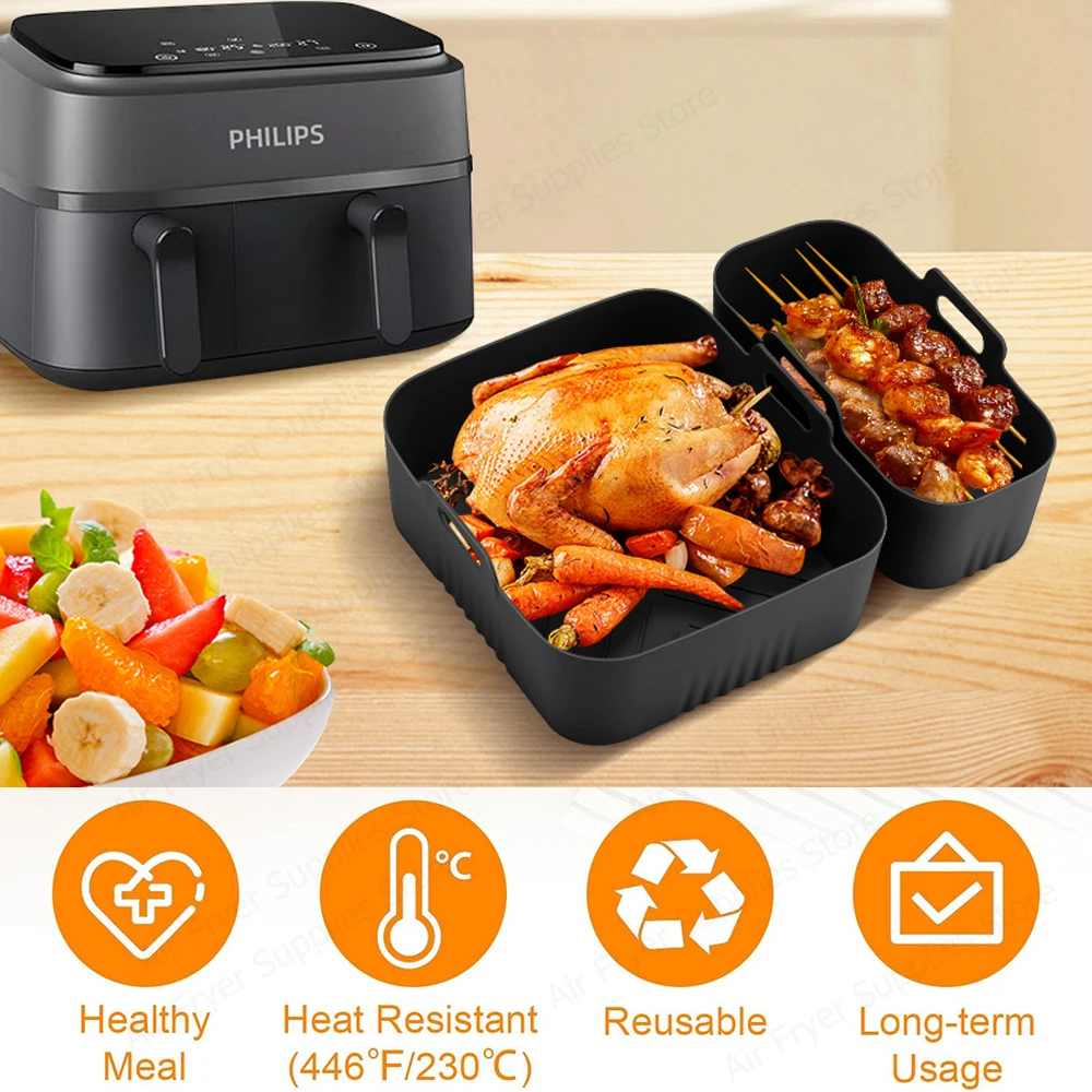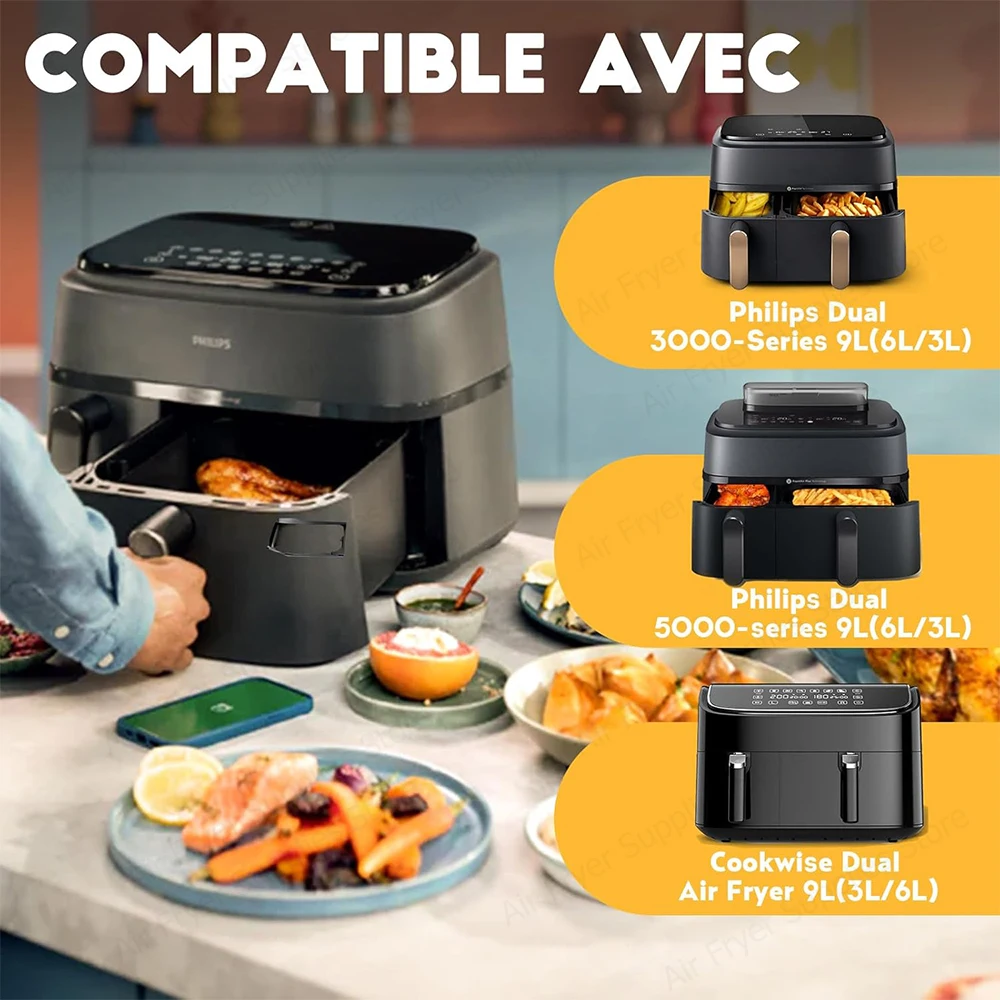 Résistance à la chaleur Les accessoires en silicone sont conçus pour résister aux températures élevées sans se déformer, ce qui les rend compatibles avec les friteuses à air. 2Paquet Moule Silicone Air Fryer Accessoires, Pot pour Friteuse à Air Ensemble d’accessoires pour friteuse à air 15 pièces : Cet ensemble complet d’accessoires pour friteuse à air comprend : 2 moules en silicone pour friteuses à air (6 L/3 L), 4 pocheuses à œufs en silicone, 2 moules à pain, 2 moules à gaufres (6 L/3 L), 2 gants en silicone, 1 pince en silicone, 1 spatule en silicone et 1 pinceau à huile. Accessoires Air Fryer Philips Pour Philips Dual Basket Airfryer Série 3000 9 Litres(6/3L) - 23 Pièces Air Fryer Accessoires Pour Philips Airfryer Série 3000-5000, , Moule Cake, Pain, Grille Racks Etc Moule Air Fryer Avantages : Silicone alimentaire Fabriqué en silicone alimentaire non toxique, il garantit sécurité et fiabilité pour la cuisson et la préparation des aliments. Ensemble polyvalent Cet ensemble complet comprend divers accessoires tels que des moules, des plateaux, des gants, des pinces, un grattoir et une brosse, offrant une solution complète pour la friture à air. Philips 5000 9L Dual Basket Airfryer | Preisvergleich bei Il s'agit d'un accessoire personnalisé pour Philips la friteuse à air à double panier série 3000., Accessoires améliorés pour friteuse à air : Nos accessoires allient fonctionnalité et design élégant, ce qui les rend parfaits pour Philips les friteuses à air à double panier série 3000-5000., Réutilisables, ils sont parfaits pour de multiples séances de cuisine, parfaits pour les repas de famille et les occasions spéciales. Il répond aux différents besoins de cuisson des friteuses à air. 2 Pièces oule Silicone Air Fryer pour oulinex Easy Fry Dual EZ9018 5... Fonctionnalité améliorée Les accessoires supplémentaires élargissent les capacités de votre friteuse à air, vous permettant de cuisiner une plus grande variété de plats et d'expérimenter différentes recettes. Expérience culinaire améliorée L'inclusion de divers moules et plateaux offre un large éventail d'options de cuisson, de la cuisson de gâteaux à la confection de gaufres, améliorant ainsi la polyvalence de votre friteuse à air. Compatibilité avec Philips les friteuses à air à double panier séries 3000-5000 : Nos moules à gaufres et inserts réutilisables en silicone pour friteuse à air sont spécialement conçus pour Philips les friteuses à air à double panier séries 3000-5000 (NA350/00) (NA550). L’ensemble comprend : 2 moules en silicone pour friteuse à air (6 L/3 L), 4 pocheuses à œufs en silicone, 2 plaques de cuisson à pain, 2 moules à gaufres (6 L/3 L), 2 paires de gants en silicone, 1 pince en silicone, 1 grattoir en silicone et 1 pinceau à huile. Matériau en silicone de qualité alimentaire résistant à la chaleur : L’insert en silicone pour friteuse à air est fabriqué en silicone de qualité alimentaire, sans BPA, et résiste aux températures élevées, garantissant ainsi sa durabilité.