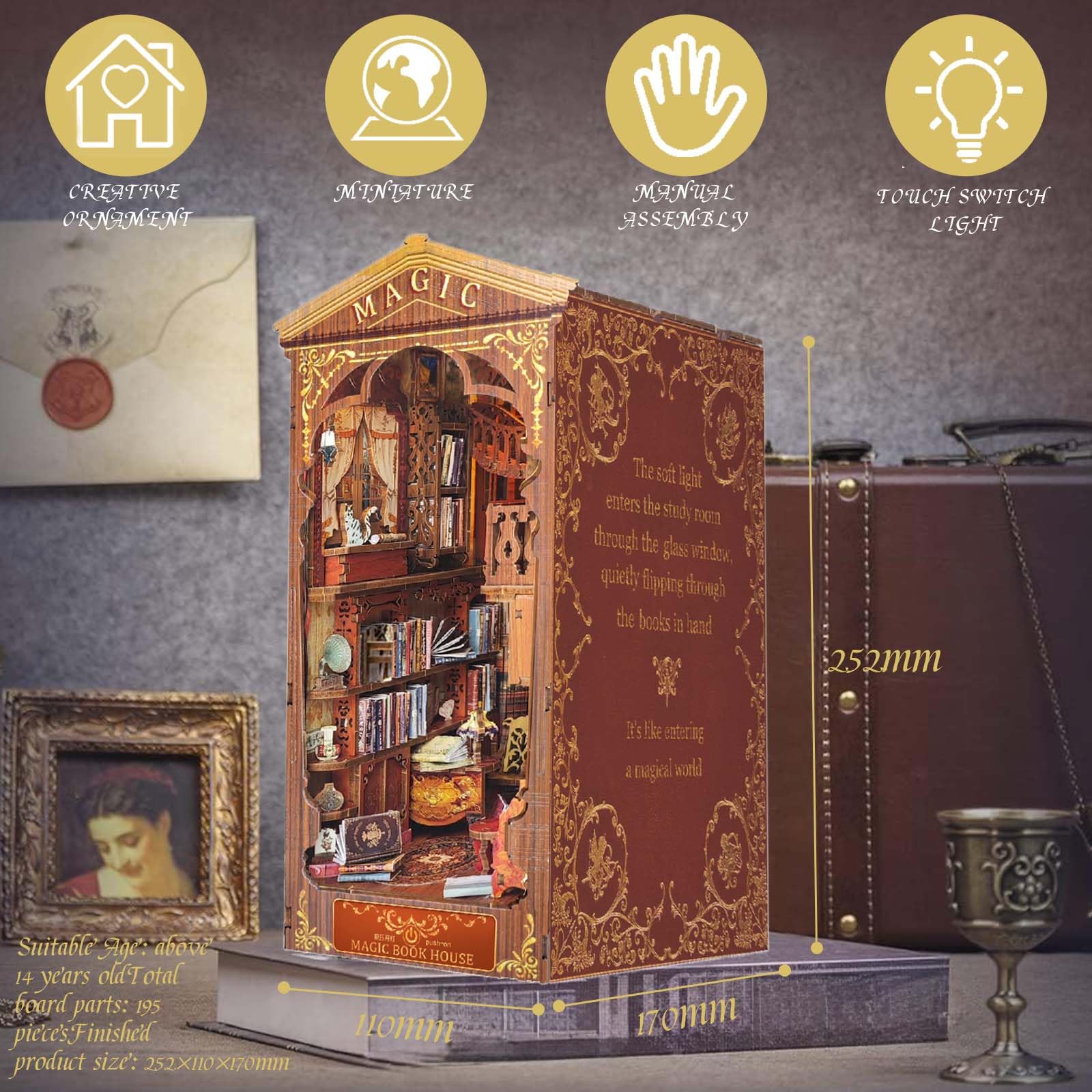Chaque détail de ce book nook transforme votre étagère en un véritable univers miniature à découvrir. Atelier De Couture Miniature à Monter Soi-même Kit Book Nook, Cadre Photo En Forme De Coin à Livres, Kit Décoration étagère éclairage LED DIY Puzzle Découvrez une pièce détaillée avec machine à coudre, croquis de mode, morceaux de tissu, rouleaux de tissu et peintures murales décoratives. Article L X L X H. 18 X 5 X 18 Centimètres. Matériau. Bois. Kit De Décoration De Coin De Livre Pour Adultes Et Adolescents. Voir Plus Alimenté par USB, il comprend une suspension et une lampe sur pied, que vous pouvez allumer séparément ou simultanément, sans besoin de piles. Ce book nook apporte une ambiance chaleureuse et personnalisée à votre bibliothèque. Miniature de Maison de Poupée à Fixer au Mur, Insert pour étagère, Puzzle 3D en Bois à Monter Soi-Même pour Décorer Une étagère. 28,89 €. sur . Aller... Book Nook Lily Atelier de Couture avec Lumières USB : Ce kit book nook prêt à assembler inclut toutes les pièces pour créer un coin lecture magique entre vos livres. Ce book nook unique transforme votre bibliothèque en véritable vitrine miniature. Book Nook Format Parfait : Conçu pour s’adapter aux étagères standard, ce book nook s’insère parfaitement entre vos livres, créant une pause visuelle captivante dans votre collection. Kit de coin de livre à faire soi-même, kit de coin de livre Book Nook Cadre Polyvalent : Ce book nook unique en forme de cadre photo peut être exposé horizontalement sur une table ou une étagère, ou fixé au mur. Ce book nook transforme votre bibliothèque en un véritable espace miniature à contempler.